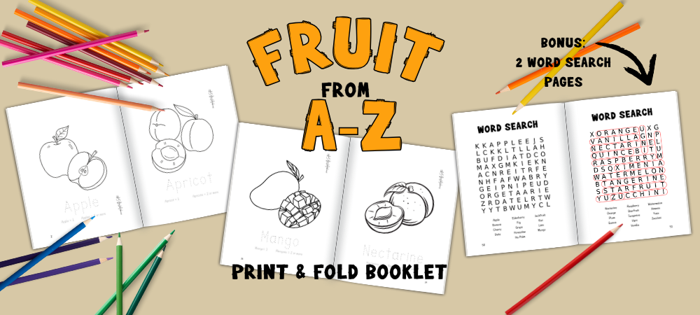 BONUS: Includes an additional fruit + two word searches at the end of the booklet. (as compared to the printable colouring pages pack)