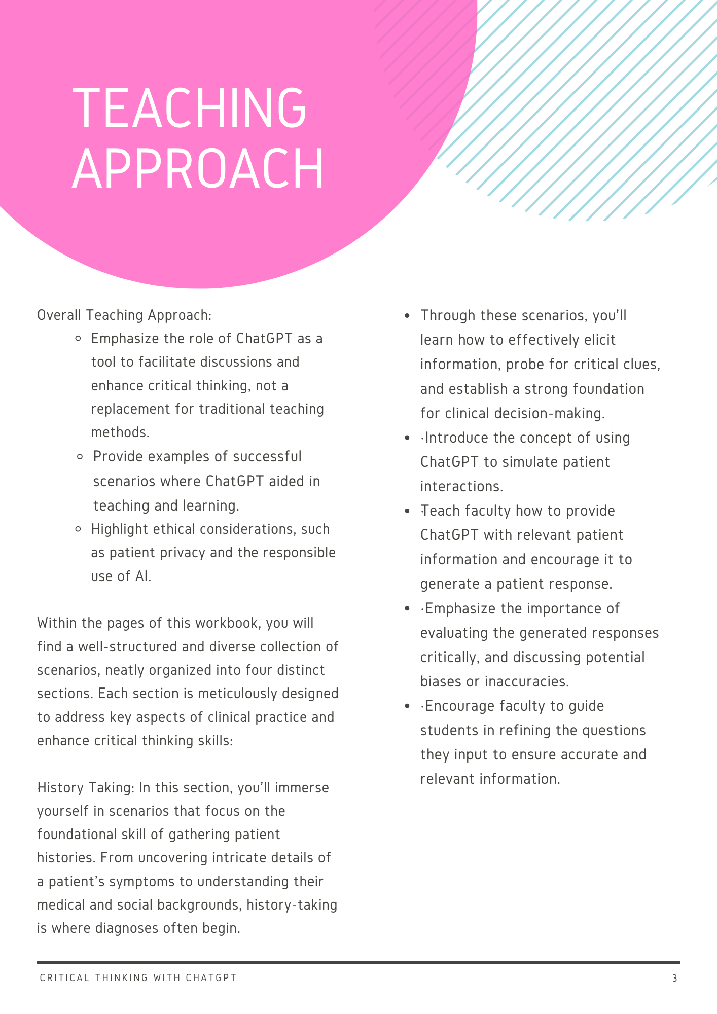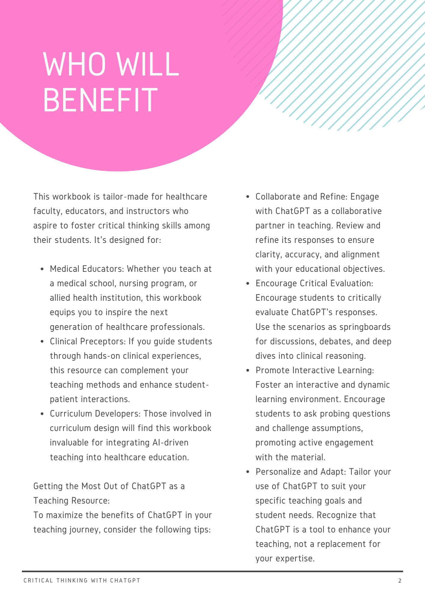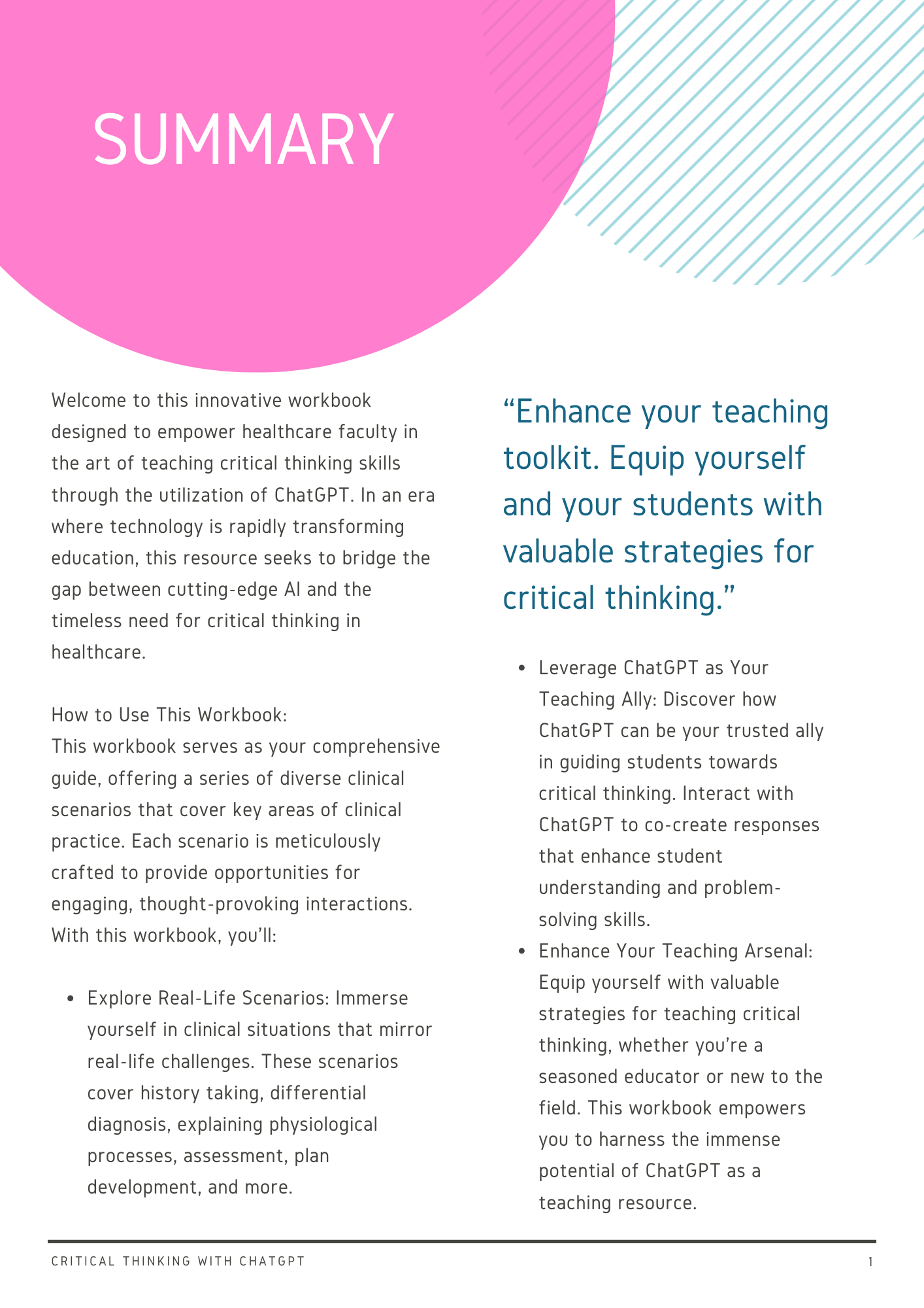 This workbook is designed to empower healthcare faculty in the art of teaching critical thinking through the use of ChatGPT. In an era where technology is rapidly transforming education and healthcare, this resource seeks to bridge the gap between AI and developing critical care thinking in healthcare education. This workbook is sure to increase your confidence in teaching using AI and improve student engagement no matter the learning environment.