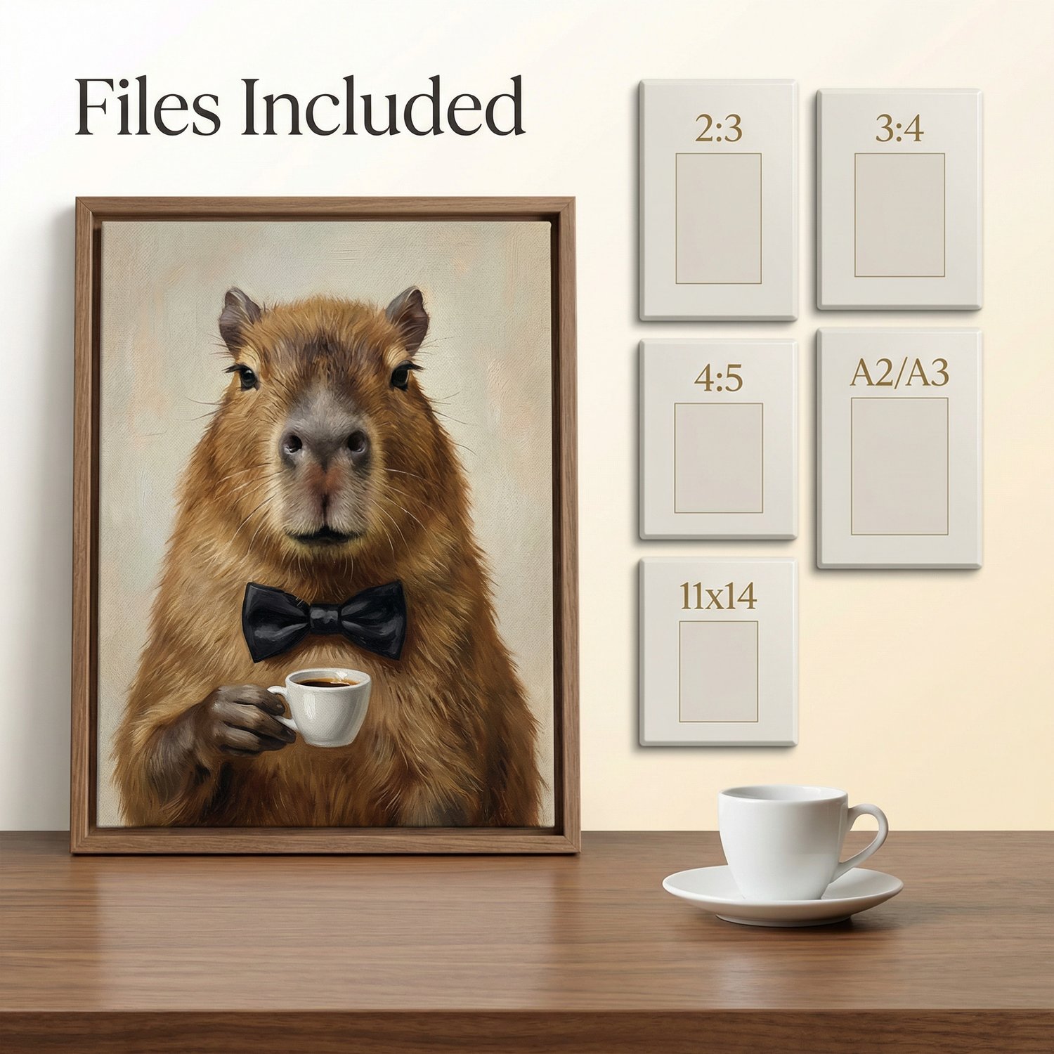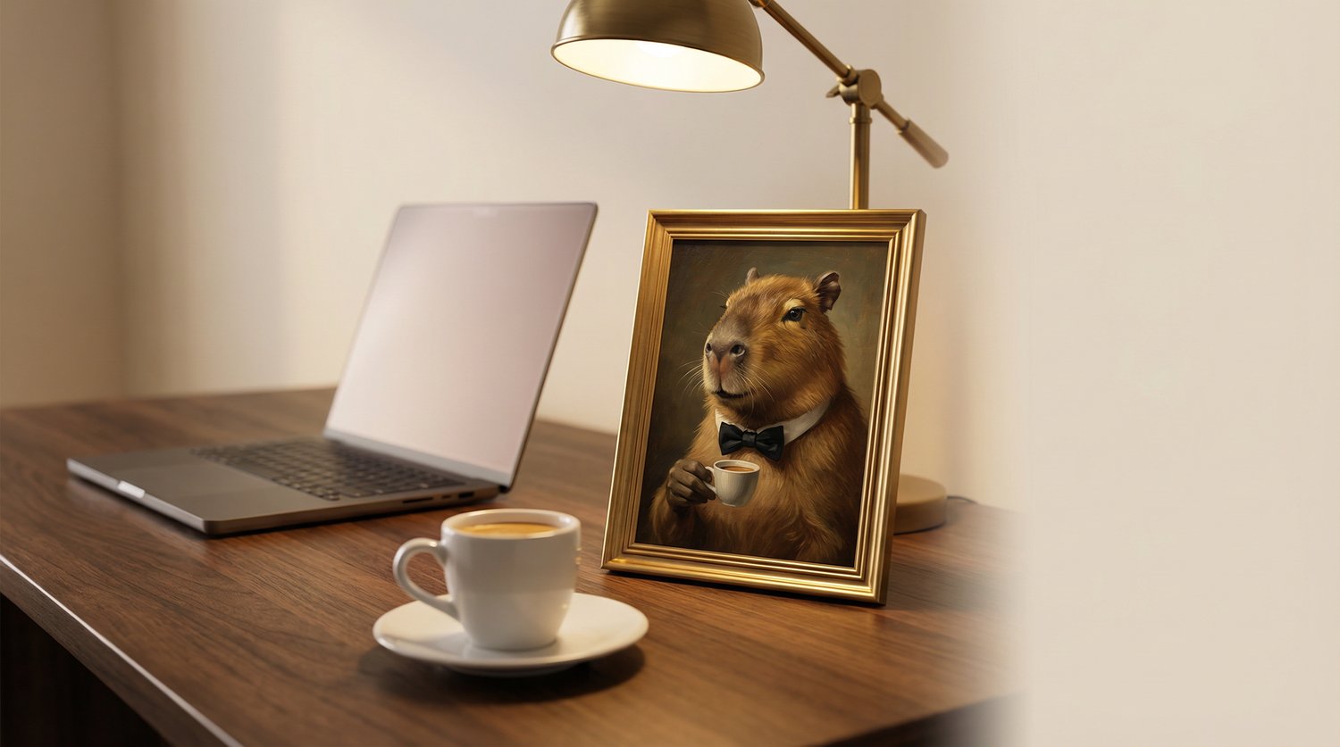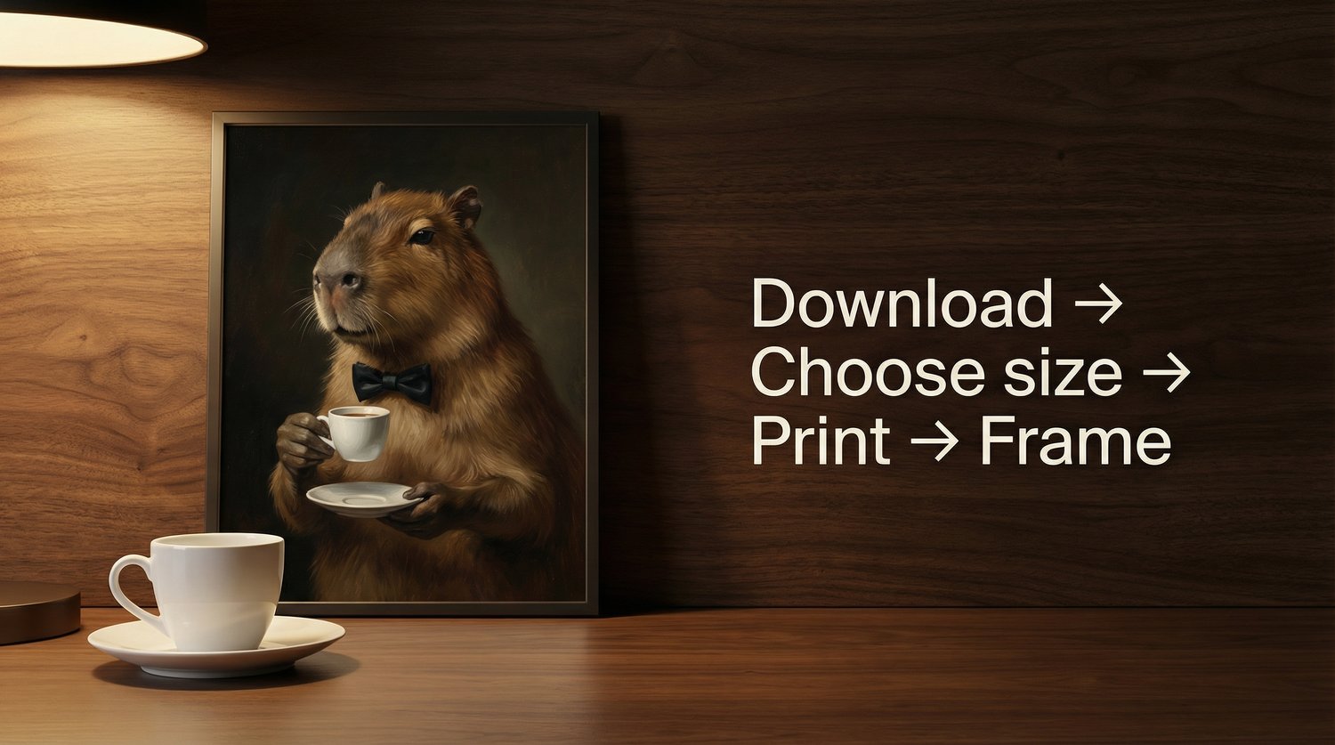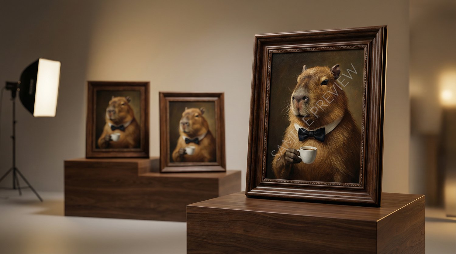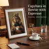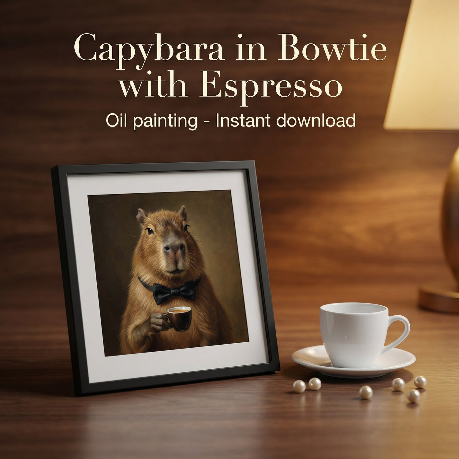 A collectible whimsical-luxury oil painting printable featuring a capybara in a bowtie paired with espresso—warm museum lighting, rich brushwork, and an editorial finish designed to look stunning in common frames.
