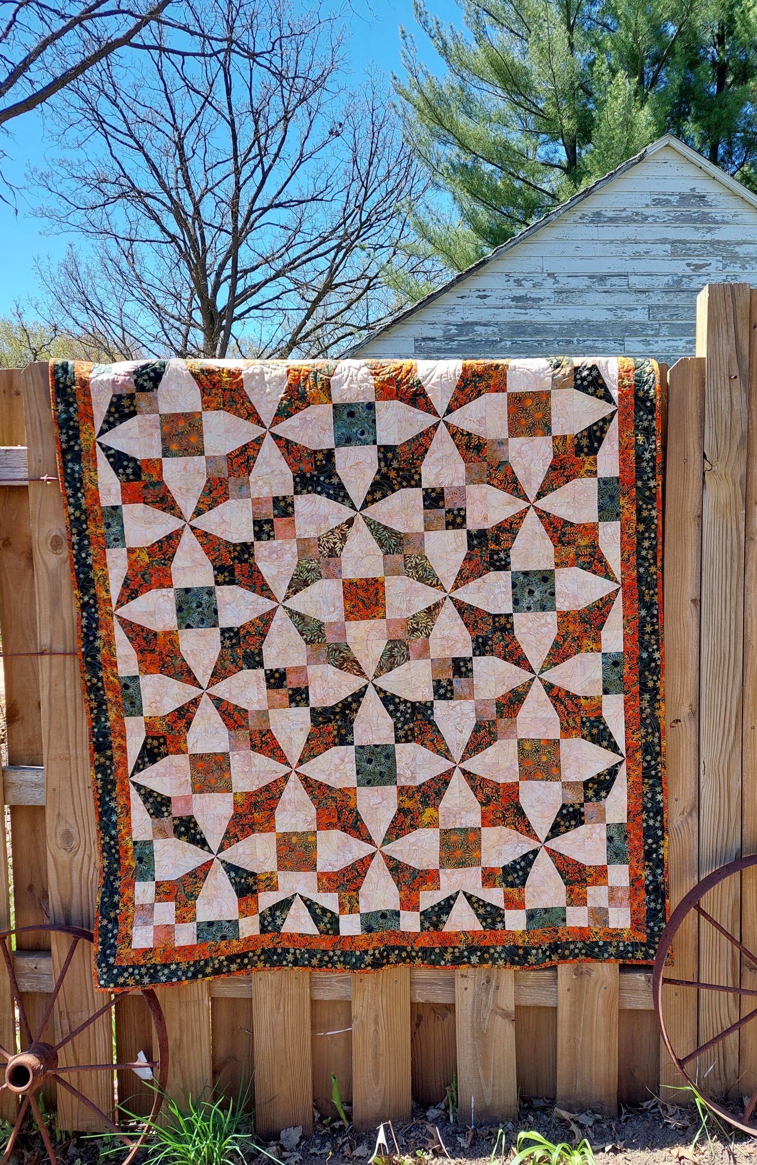The quilt on the fence is one that I made with Flutter Fields by Island Batik. The other quilts were made by testers Dotty, Ruth, and Sherry.