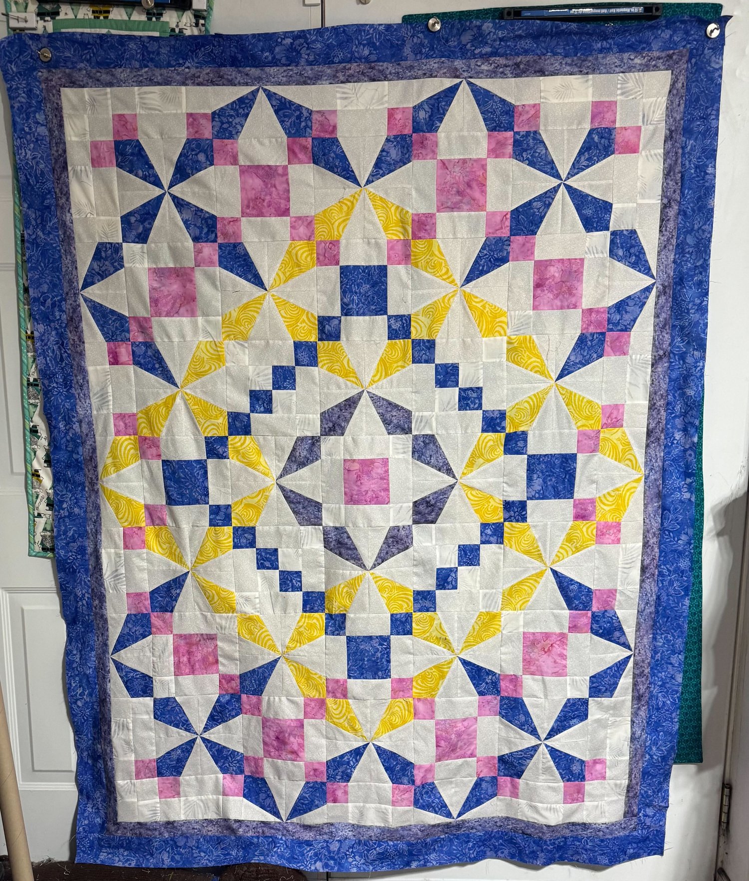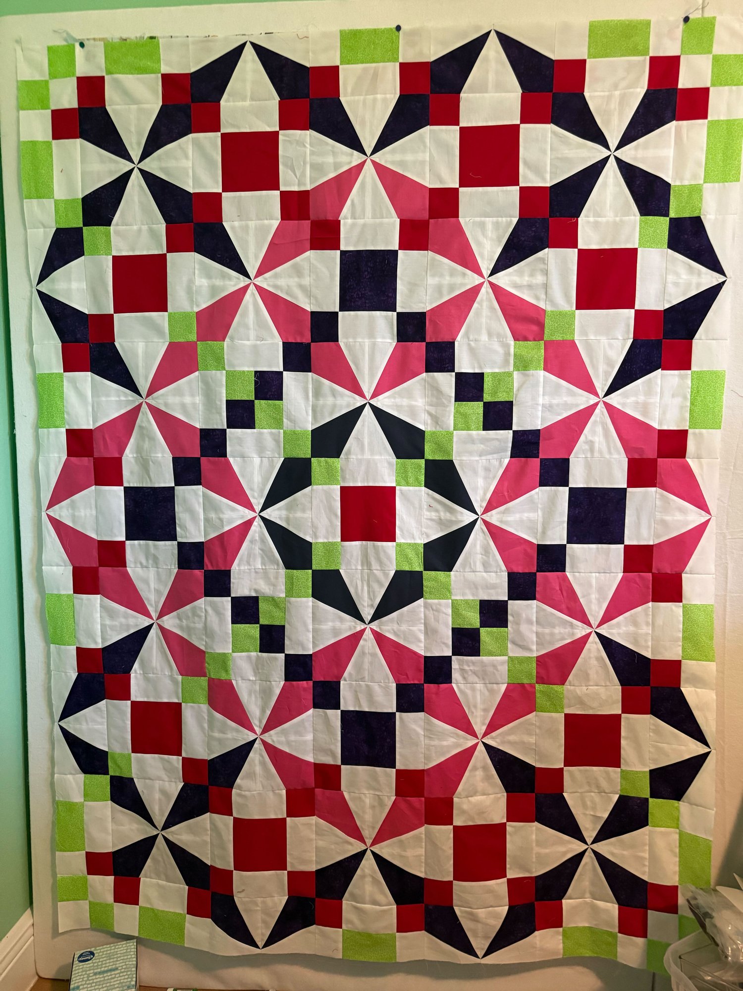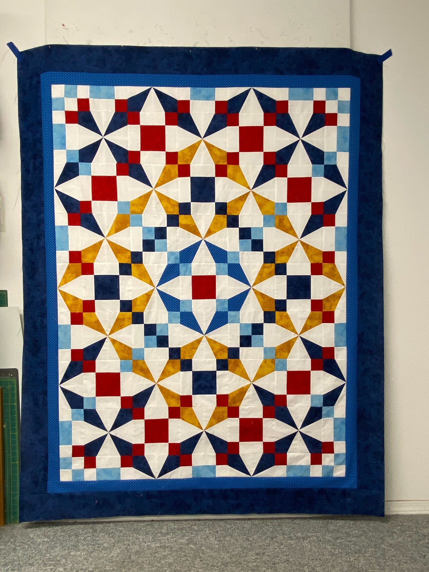 Skill level: intermediate– specialty rulers or templates; if any fabrics are directional, you’ll need to take care when sewing to keep them facing in the correct direction.