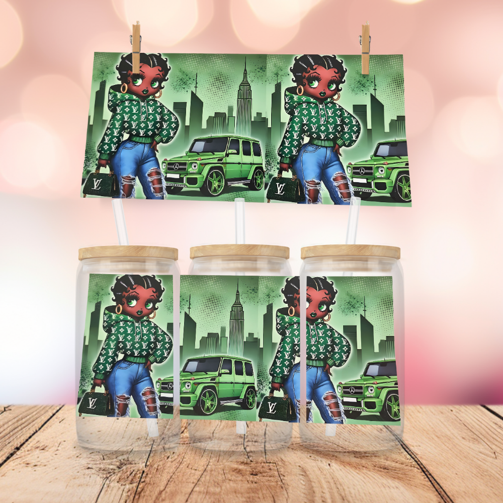 Let Miss B bring the glow with this Green Background Wrap, where style meets freshness! Designed to fit 16 oz Libbey glass cans or tumblers, this wrap features the ever-fabulous Miss B posed against a vibrant green backdropβperfect for spring vibes, bold statements, or simply standing out in style.