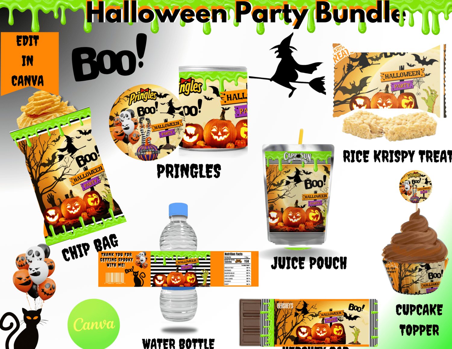This is a digital download. 7 Frames are included in this party Halloween Party Favor Bundle. Includes Chip bag, Juice pouch, Rice Krispy Treat, Pringles, Cupcake Topper, Hershey Bar, and Water Bottle with design.