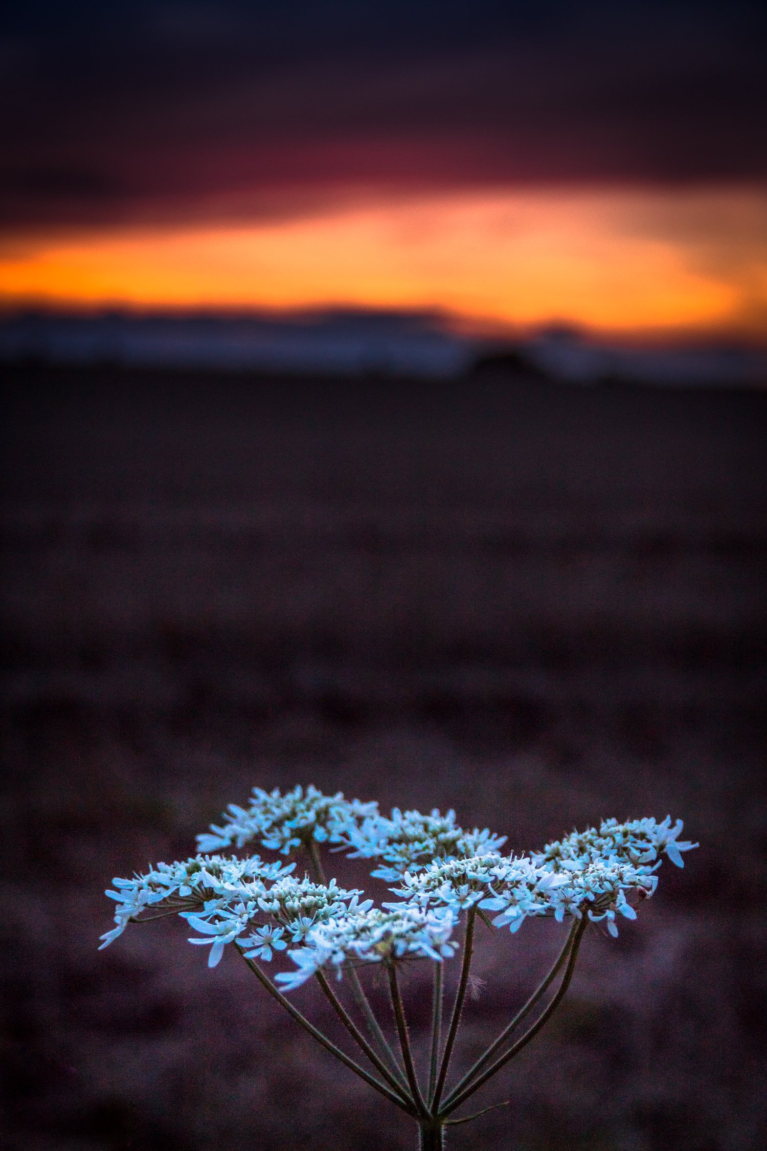Late-spring evening light catching the lace-like heads of cow parsley, silhouetted against a fading blue and amber sky. A quiet, fleeting moment where day and night meet, and the countryside softens into calm.