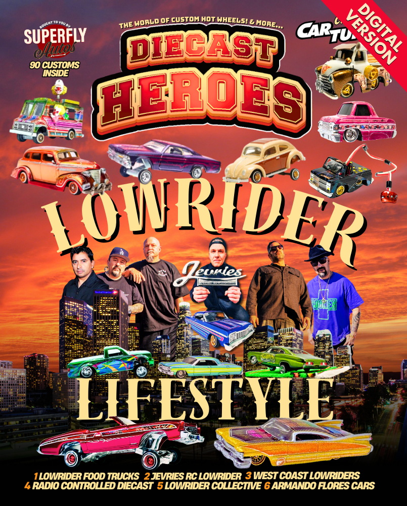 Welcome to volume 20 of Diecast Heroes Magazine 'The world of custom Hot Wheels & More'. In this edition we travel to the West Coast of America to California to bring you some of the lowrider lifestyle that is legendary the world over! We have 90 custom lowrider diecast builds from Hot Wheels, Jada, Matchbox and Cartuned. We even have an exclusive feature on legendary tattoo artist Mister Cartoon and his incredible Lowrider ice cream truck that took ten years to build, a special of Jevries Radio Control lowrider builder from Holland with his 1/64 scale lowrider pickup and much more!
