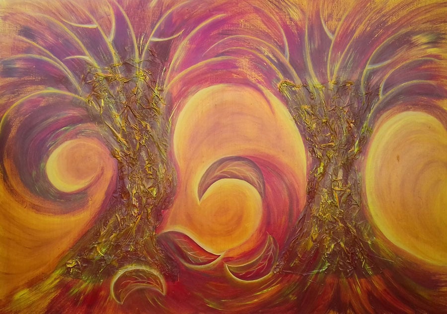 Gates of Autumn features two abstract trees in rich shades of orange, red, brown, and yellow, evoking the swirling dance of autumn leaves. The 3D texture on the trunks adds depth and movement, while the swirling foliage creates the illusion of portals leading to another world.