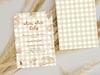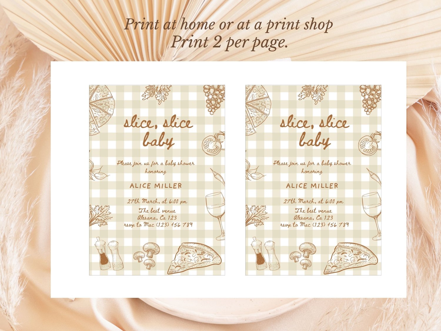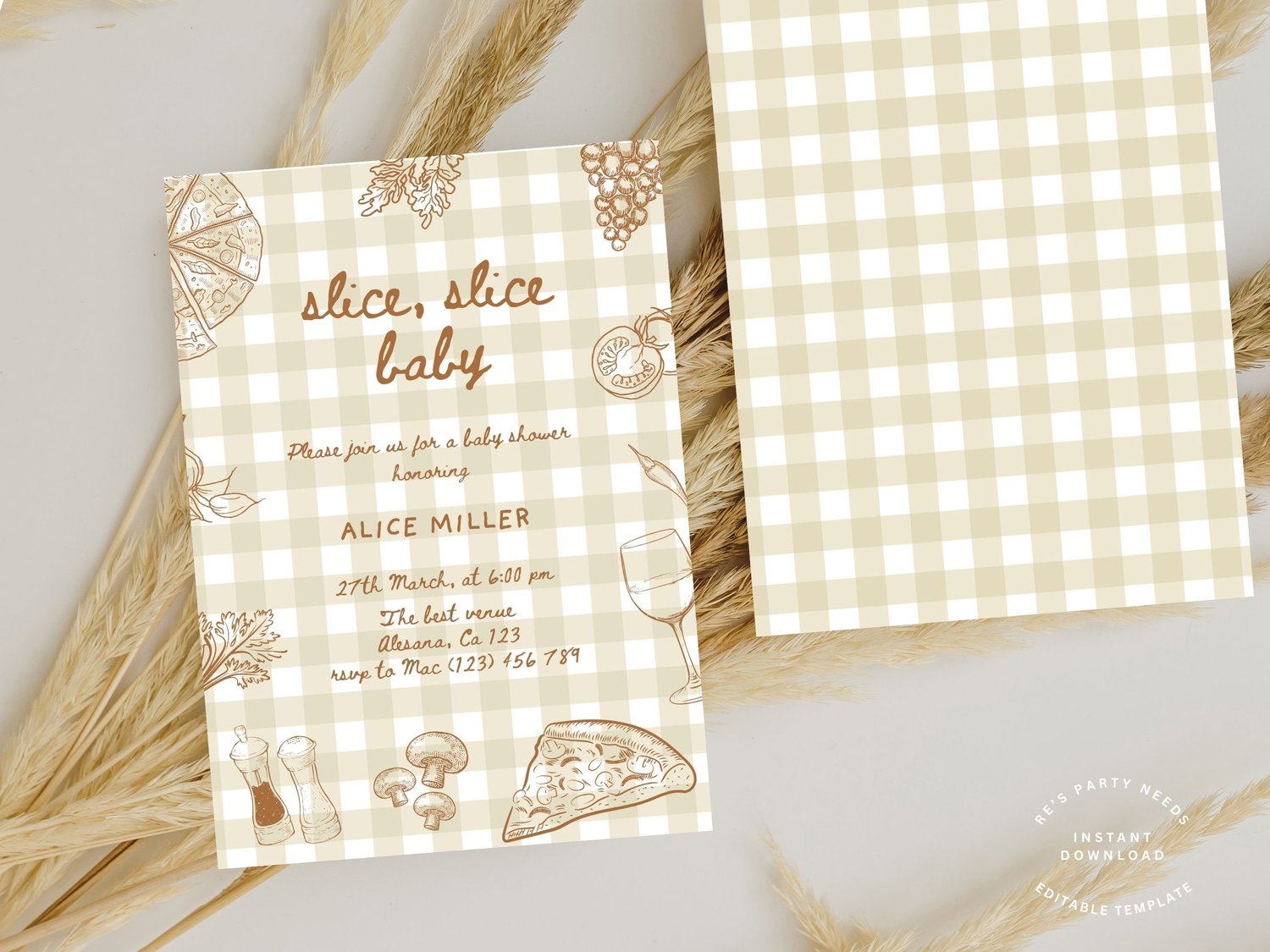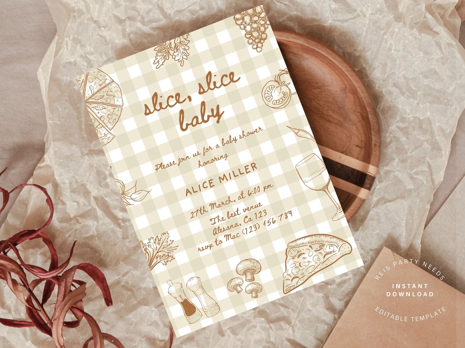 This editable baby shower invitation template features a warm neutral gingham background with hand-drawn pizza illustrations, giving it a charming and trendy look your guests will love.