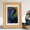 This painting is part of a 5x7 inch series of people portraits hand-painted by Ken Law. It has approximately a half-inch white border for easy framing.