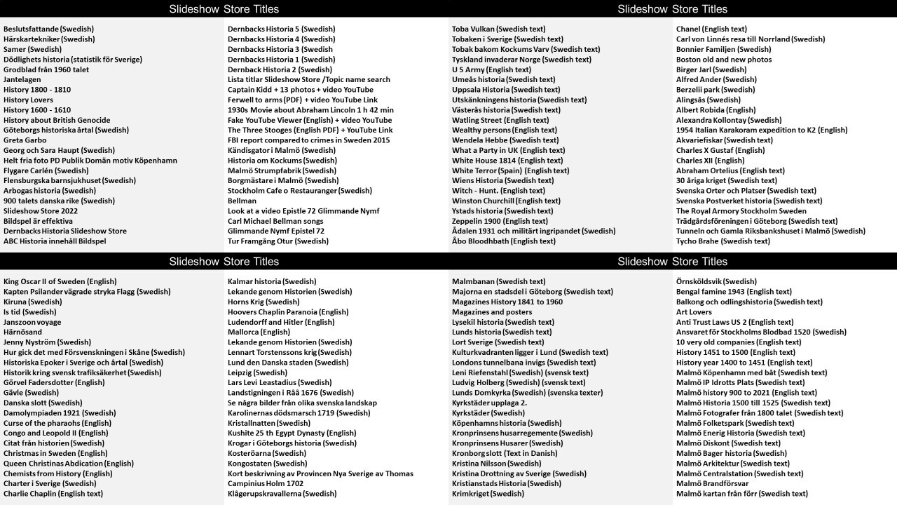 Pris är 5 USD + Moms 25 % och filformat är PPT. (Power Point) vilket kan ändras och nya bilder eller ändringar kan införas. Praktiskt för utbildning som kan anpassas för nya behov eller strategier. Klicka på länken för att ladda hem bildspel med olika bokstäver A till Ö som första bokstav i en given titel. Vill man bara ladda hem titlar som börjar med A går det bra. Vill man bara ladda hem ett bildspel och har titeln, skriv in i butikens sökruta och ladda hem från butiken. Samma pris 5 USD + Moms 25 %. Den totala samlingen har utökats med flera tusen nya bildspel under åren 2022 till 2026.