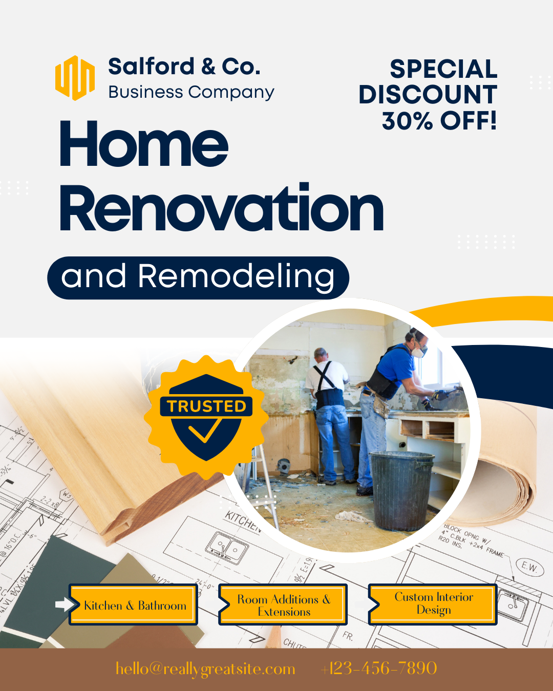 A clean, professional, and fully-editable Canva flyer template designed for home renovation companies, remodeling contractors, interior designers, and construction services. Perfect for promoting offers, services, and discounts.