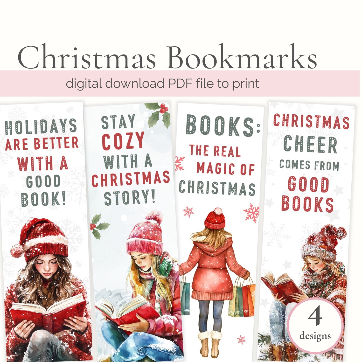 Printable PDF file with 4 Christmas bookmarks, perfect for a last minute Christmas gift for a book lover. Cute bookish present for any bookworm or yourself if you like to read. Get this file now, print it, cut the bookmarks out and let these jolly bookmarks make your holiday season even more cozy.