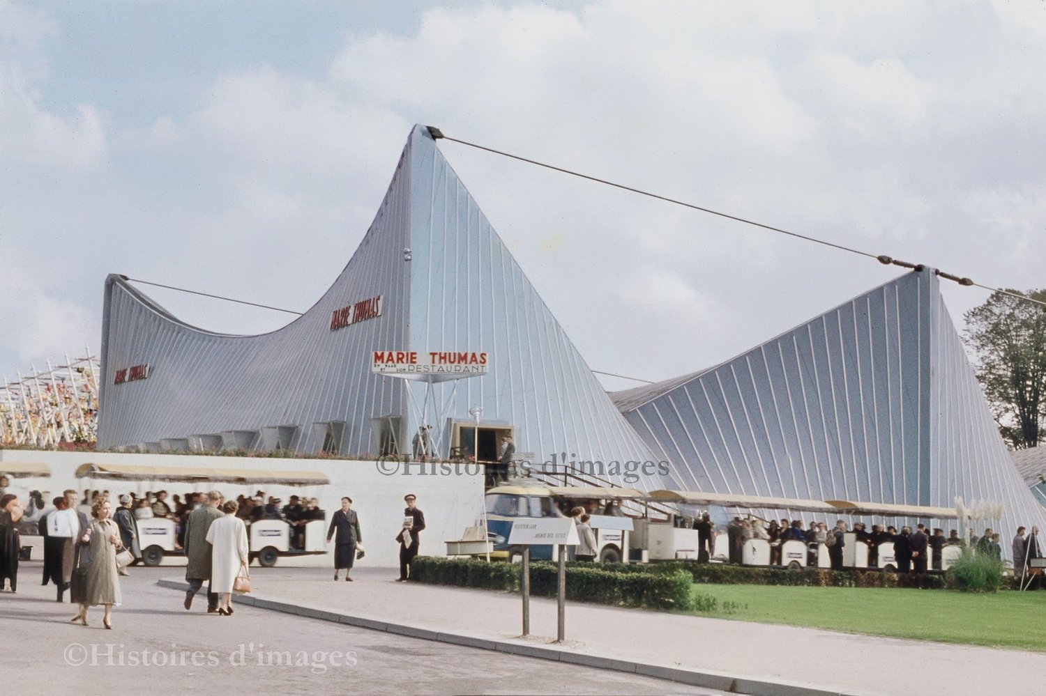 Step into the futuristic world of the 1958 Brussels World’s Fair with this striking color photograph of the Marie Thumas pavilion. This pavilion became one of the icons of Expo 58, symbolizing technological progress and post-war optimism.