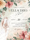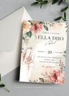 Invitación de Boda “Ella dijo Sí” Floral con Dibujo de Pareja en Acuarela, diseñada para parejas que desean un estilo romántico, delicado y artístico. El diseño combina flores pintadas en acuarela con un dibujo de pareja elegante, creando una invitación única, memorable y sofisticada.