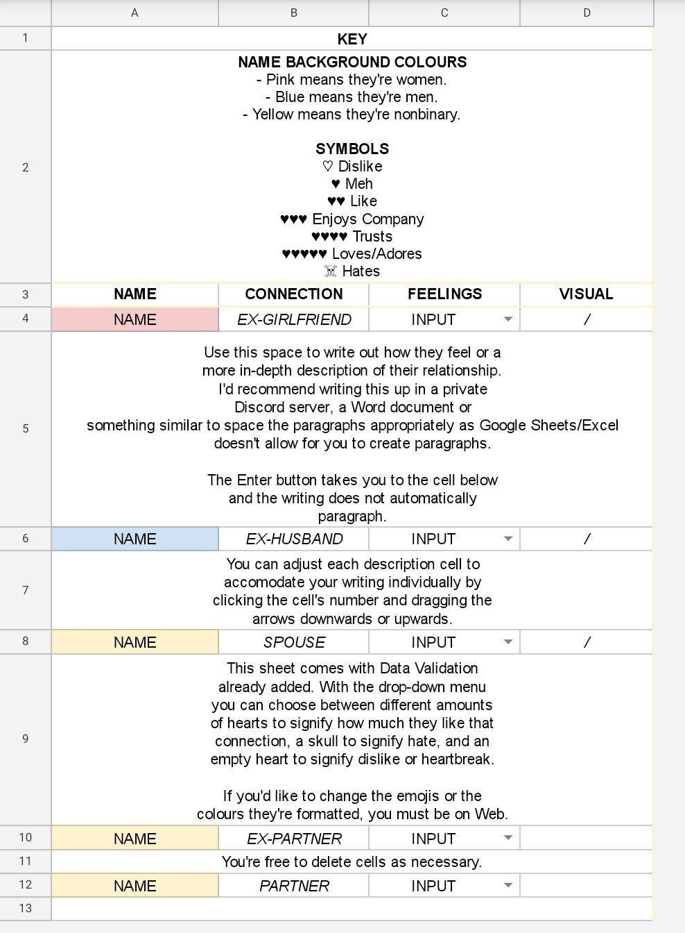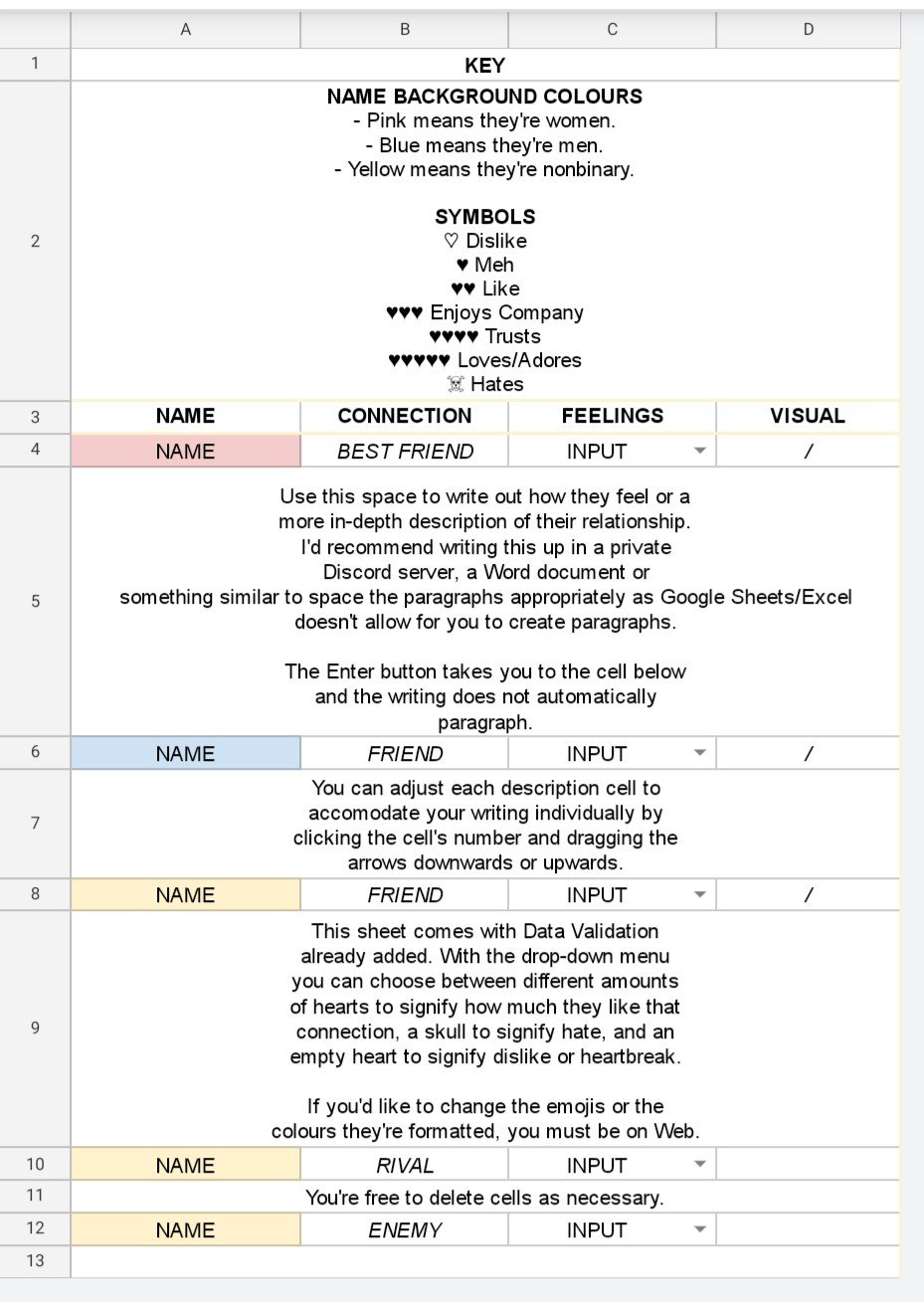 Track your character's relationships with this handy spreadsheet! It gives you space to write about their relationship, link to a visual image of the character and has a drop-down menu with Data Validation so you don't have to keep copy and pasting emojis.
