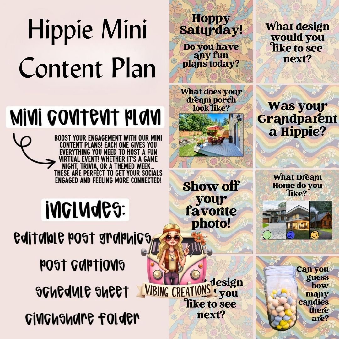 Infuse your social media with peace, love, and engagement using the Hippie Mini Content Plan from Vibing Creations! This vibrant and nostalgic toolkit is designed to help small business owners and community leaders host fun virtual events with ease. Whether you're planning a themed week, game night, or interactive challenge, this mini plan includes everything you need to get your audience talking and connecting.