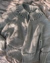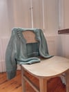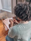 Beginning with a provisional cast-on, you’ll start at the neckline, working flat and increasing incrementally using backward loops to form the yoke. You will then separate the sleeves and body and work each separately in the round. Once the length of the body and each sleeve are reached and bound off, you’ll undo the provisional cast-on and pick up each stitch. A row of eyelets followed by a wide ribbed collar and, finally, i-cord edging to eliminate the curled edges will finish off your piece.