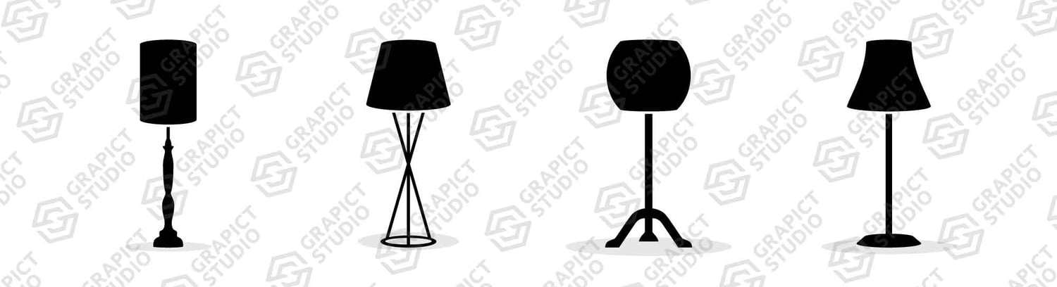 Set of 4 standing lamp icon, solid glyph, flat and gray scale color style. Outline and flat style standing lamp icon related to living room lighting, home decoration, interior design.
