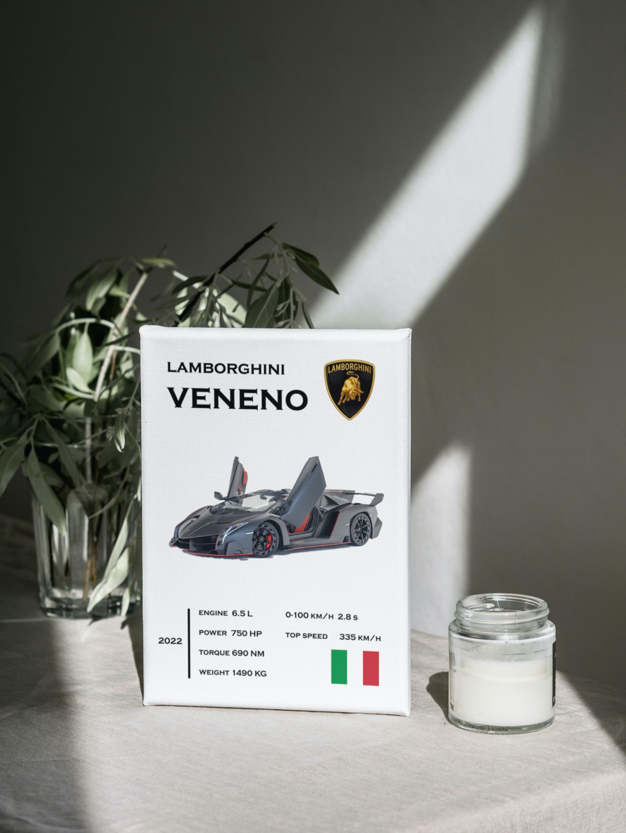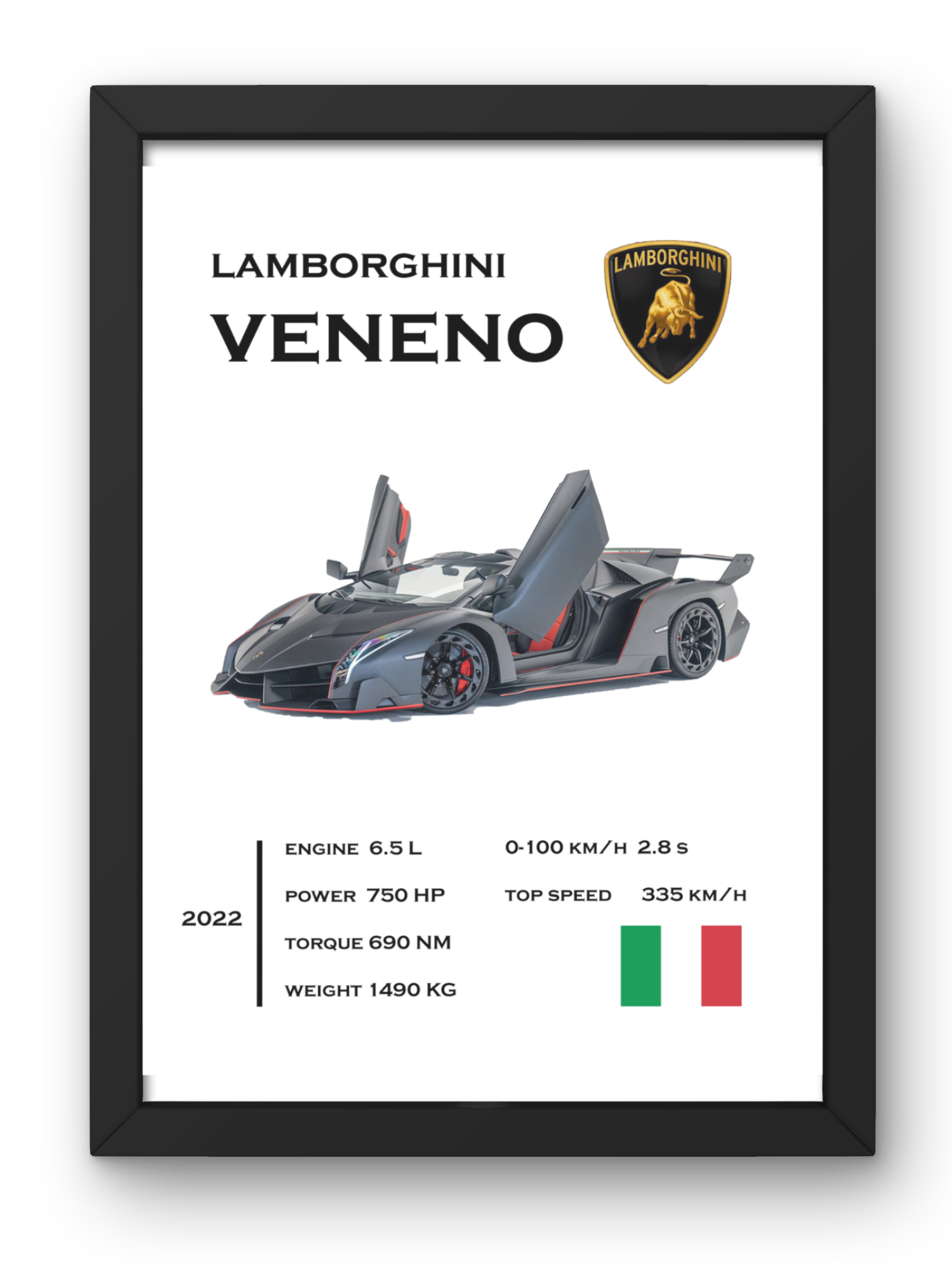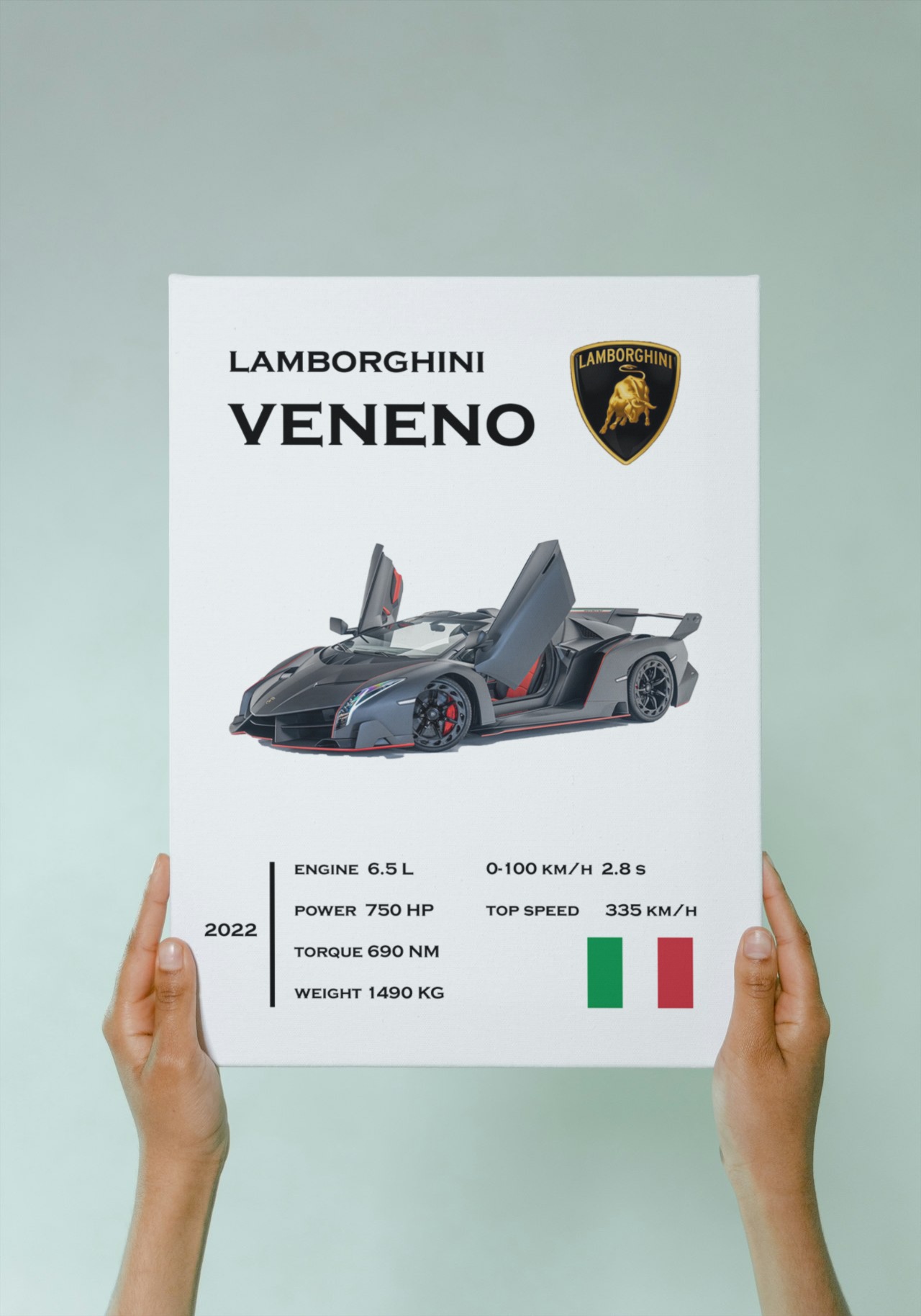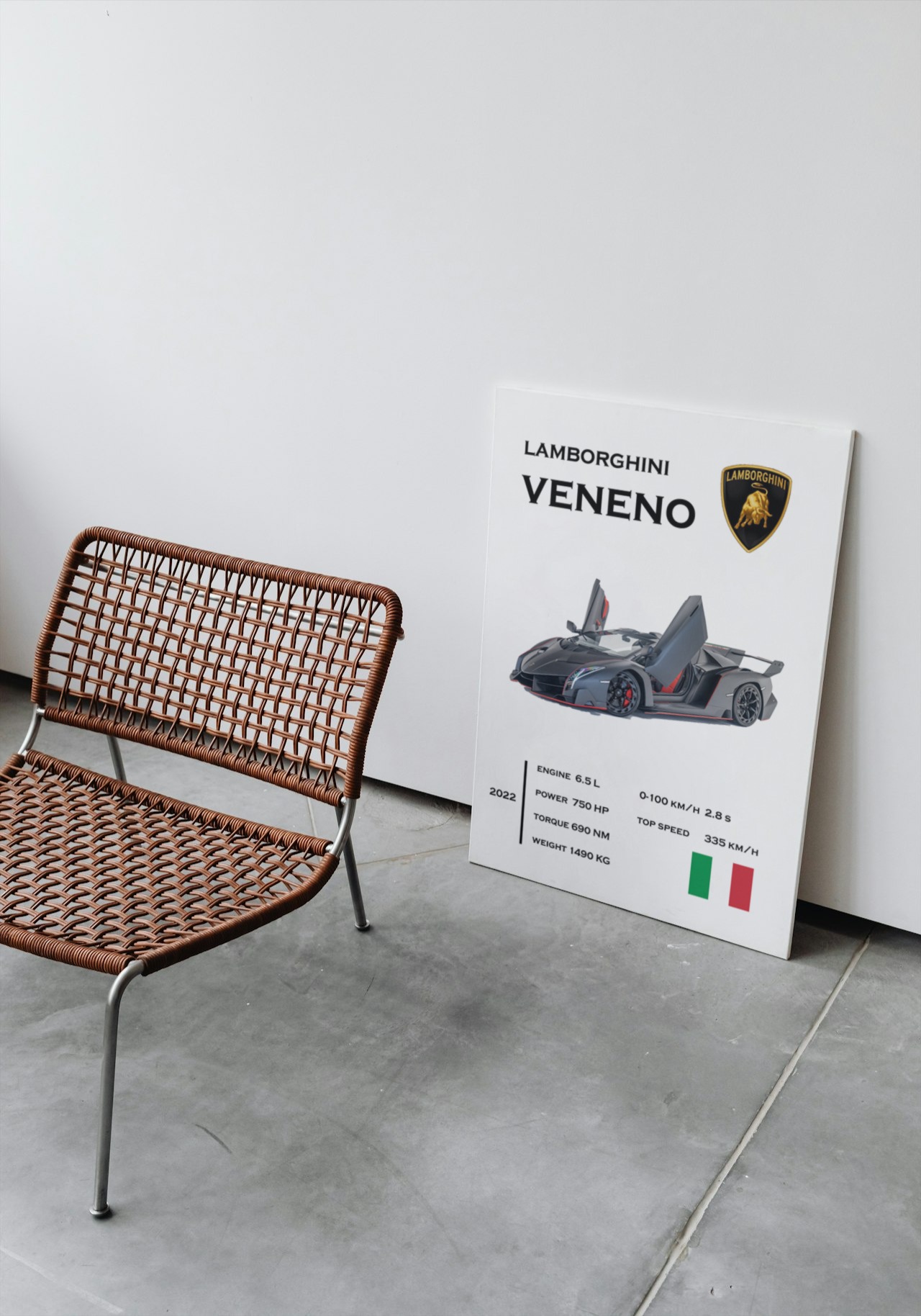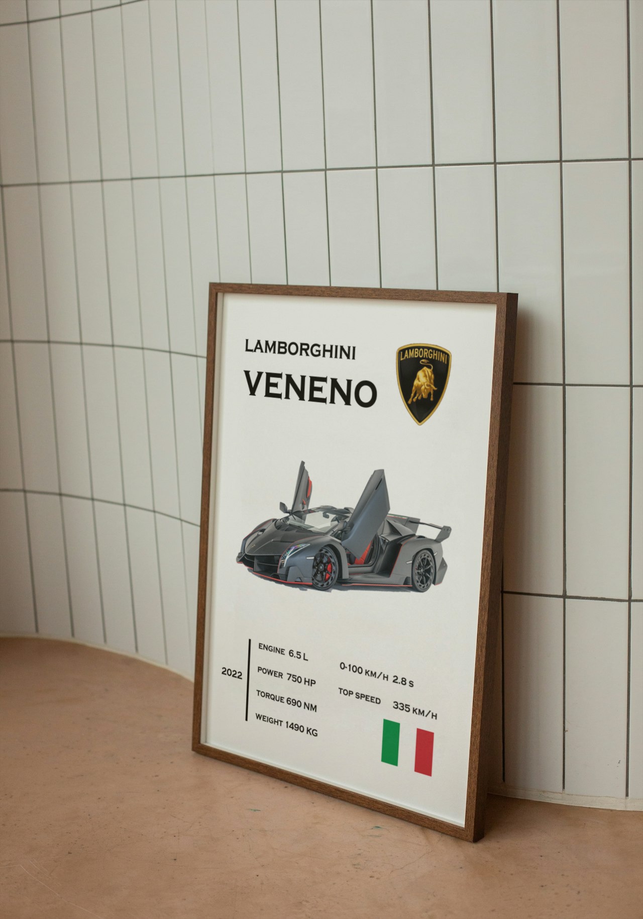 Featuring high-quality imagery and a striking design, this poster is perfect for any car enthusiast who appreciates the unparalleled innovation and allure of the Lamborghini Veneno.