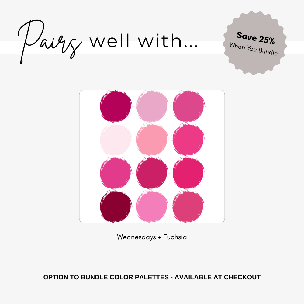 Make your brand's aesthetic stand out with our Wednesdays Color Palette, because “on Wednesdays we wear pink” - inspired by the iconic Mean Girls. Perfect for Etsy sellers and small businesses, this vibrant collection features a spectrum of bright pink and baby pink shades, offering a pop of personality to your social media and website color schemes. Included are Hex Codes, RGB, and CMYK values, making it easy to integrate these hues into your branding design. Whether you're refreshing your brand theme or just love pink, this palette is your go-to for creating cohesive and eye-catching brand colors.