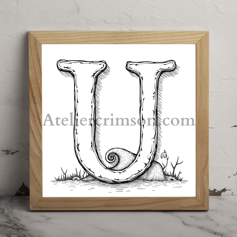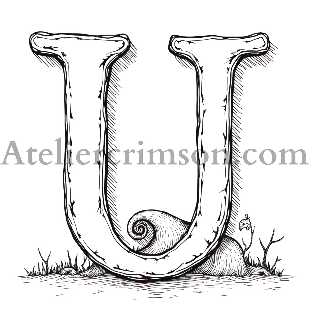The letter U colloring book jack halloween Tim Burton-inspired alphabet art. Spooky-cute character in coloring book style. Perfect for Halloween crafts or gothic decor.