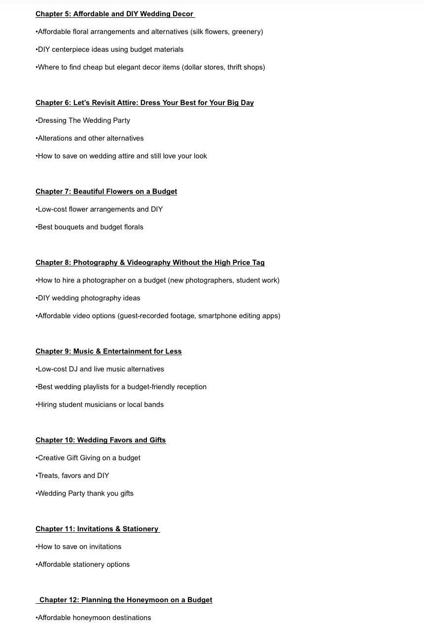 The ultimate wedding planner on a budget, plus tons of added bonus content! Over 100 pages of wedding planning content that will have you planning your dream wedding all the way from engagement photos to the honeymoon without breaking the bank! You could pay more for less other places, or you could have this all inclusive planner for less than a dollar and better results. Don’t believe me? Just try it.