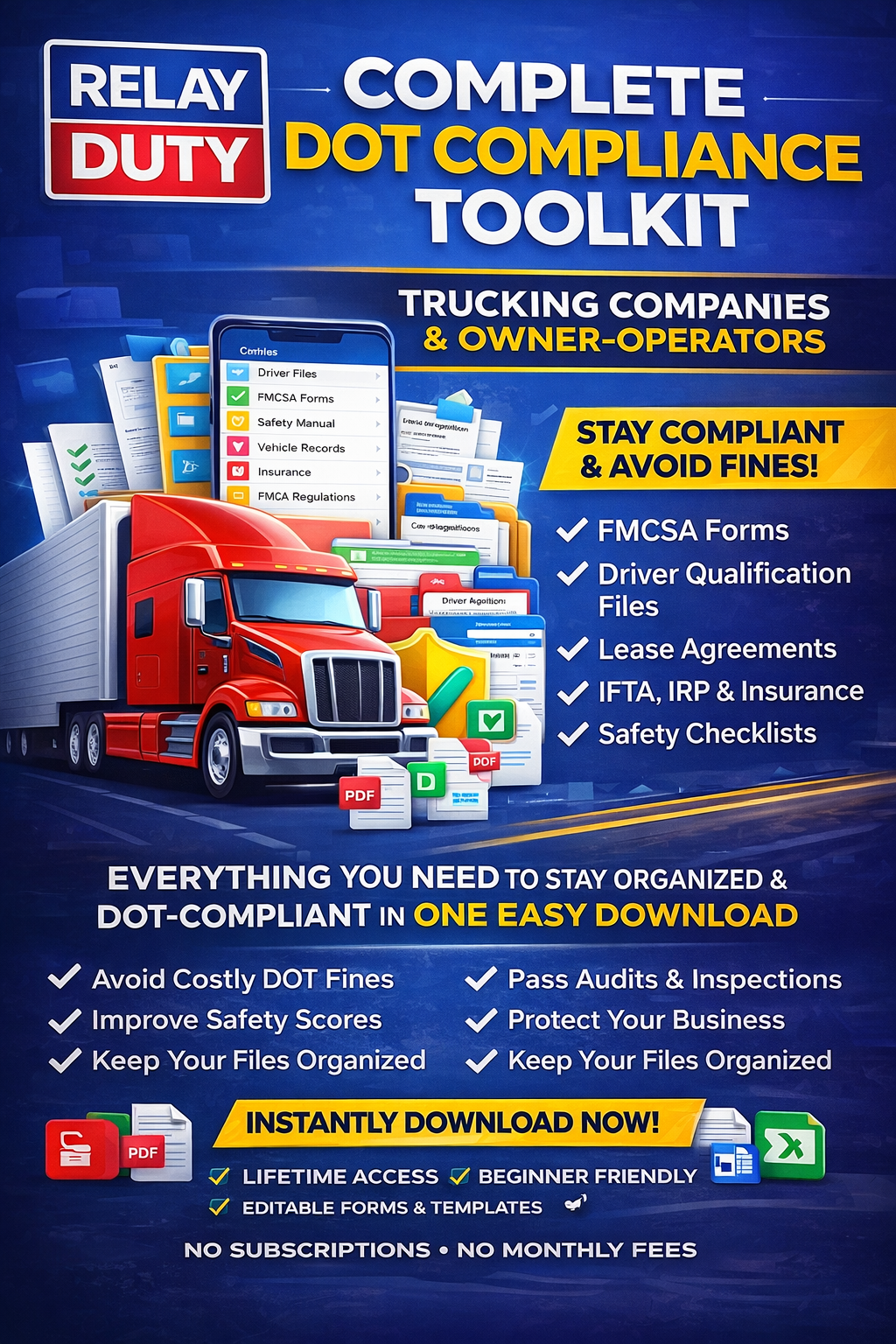 This toolkit is designed to help you organize and maintain compliance records. It does not replace legal advice or official DOT filings. Always follow FMCSA regulations and state requirements.