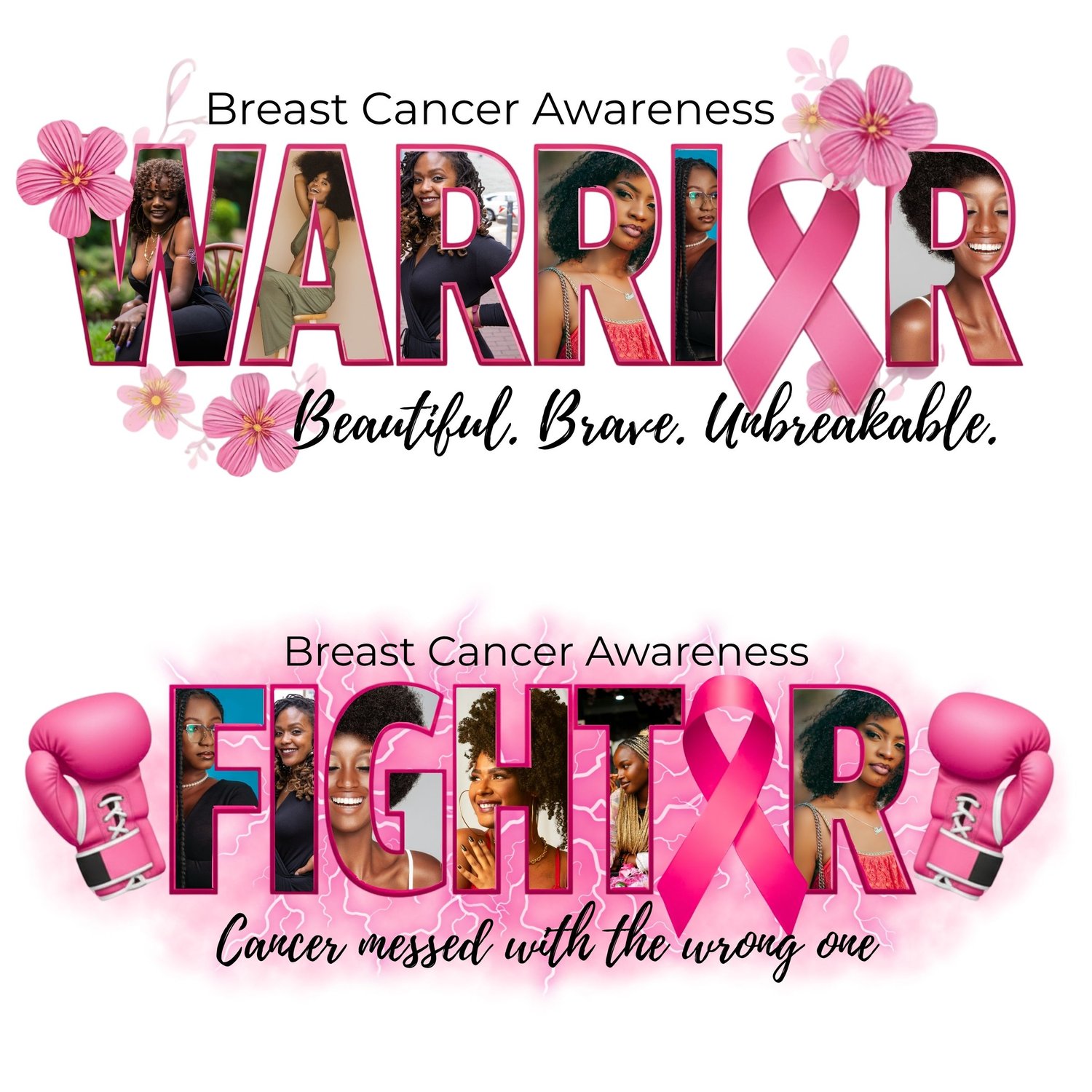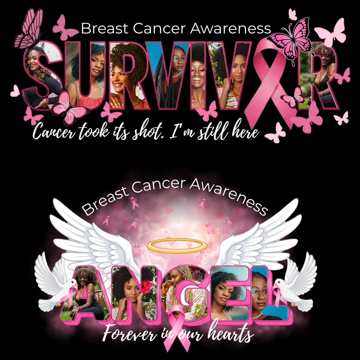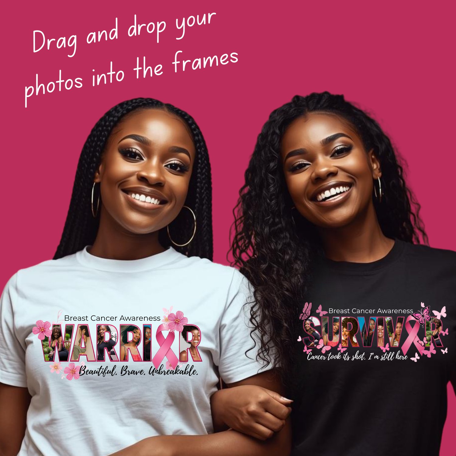 In each design you can easily drag and drop personal photos inside the word frames — perfect for honoring loved ones, survivors, and fighters with a personal touch.