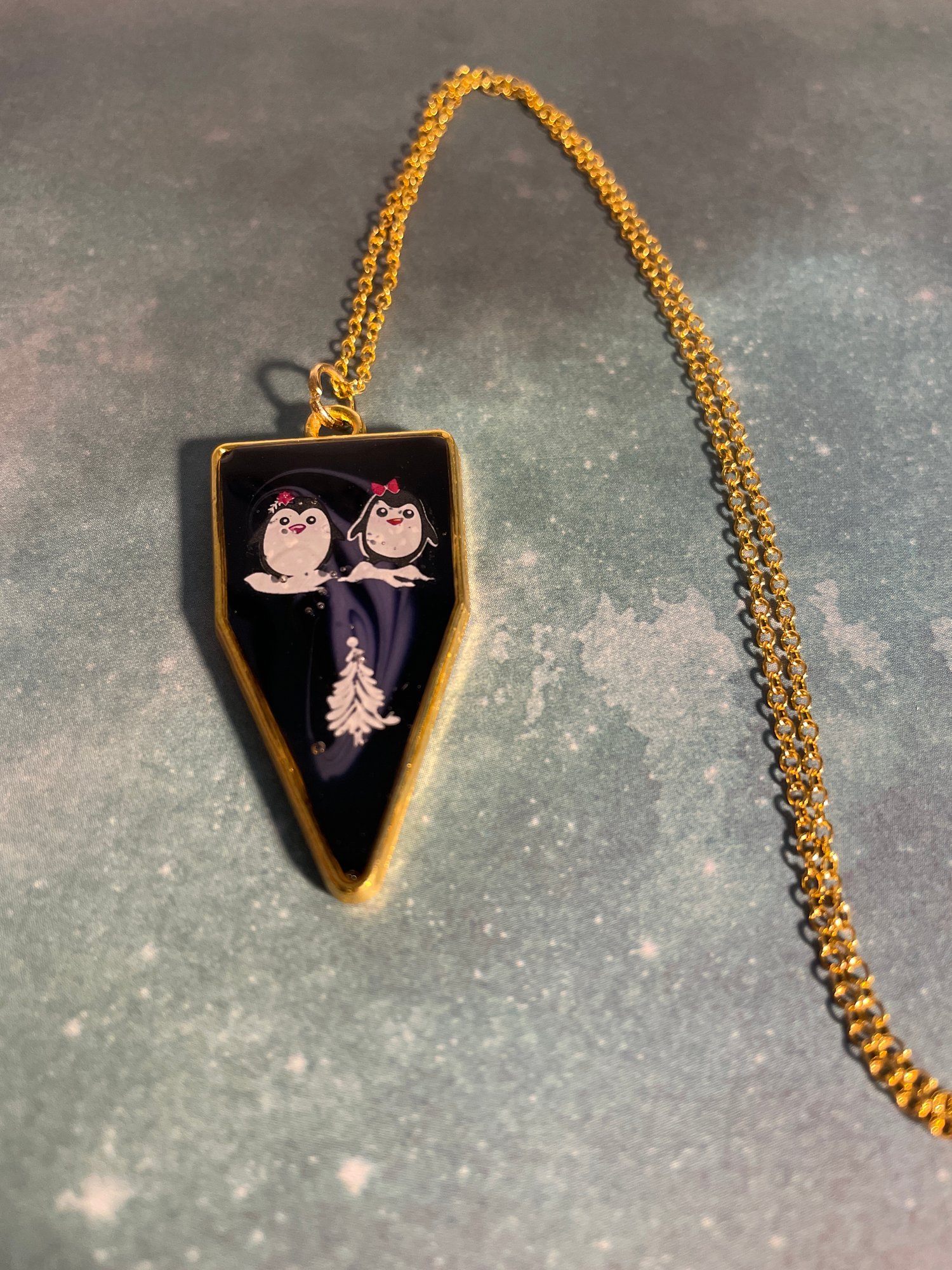 Gotta show off those penguins with a small tree. The background is a black with splash of purple set in a gold setting.