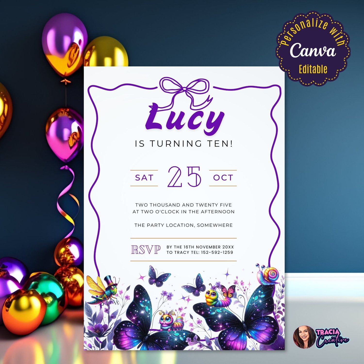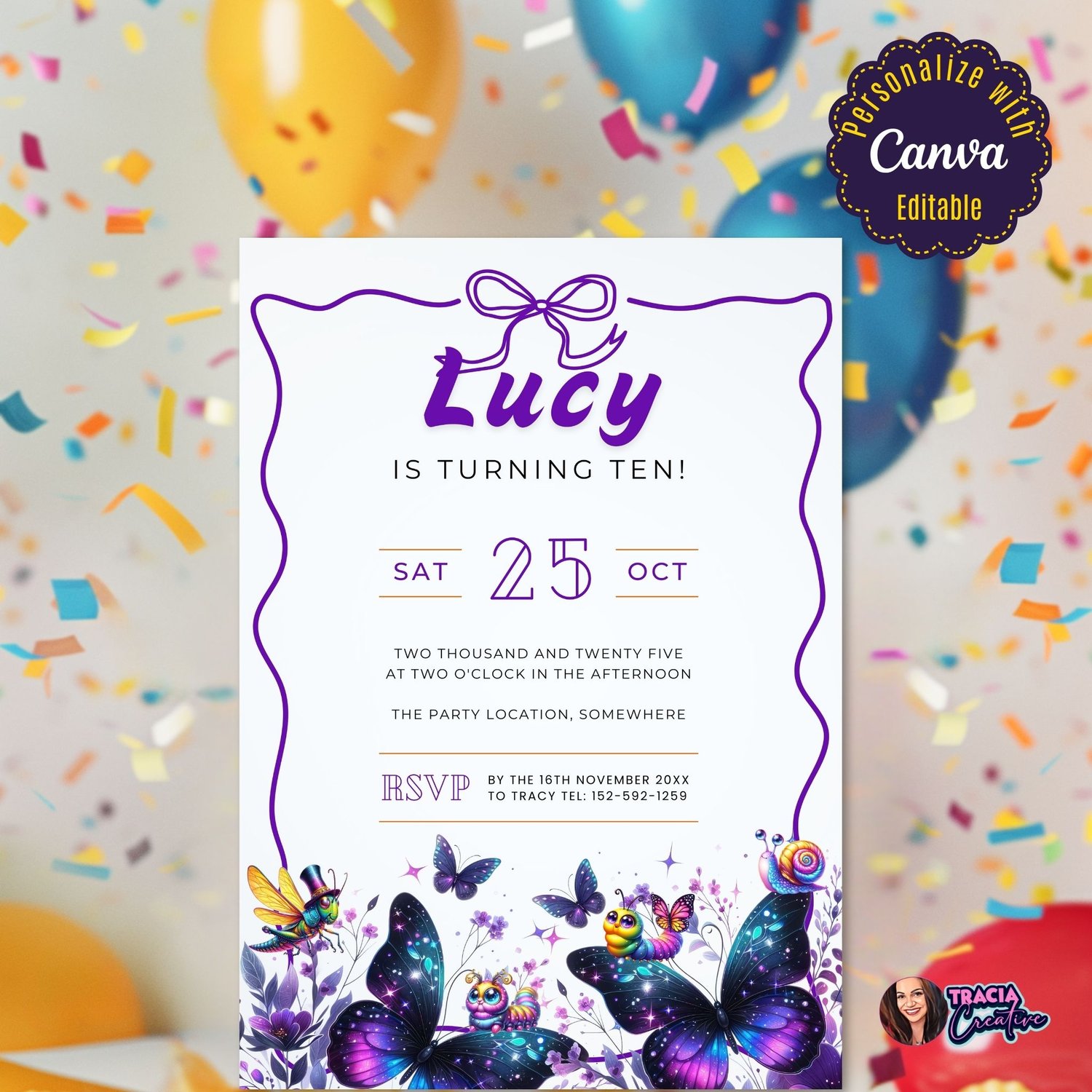 Purple Butterfly Kids Birthday Invitation - Editable Canva Template | Digital Download Party Printable
