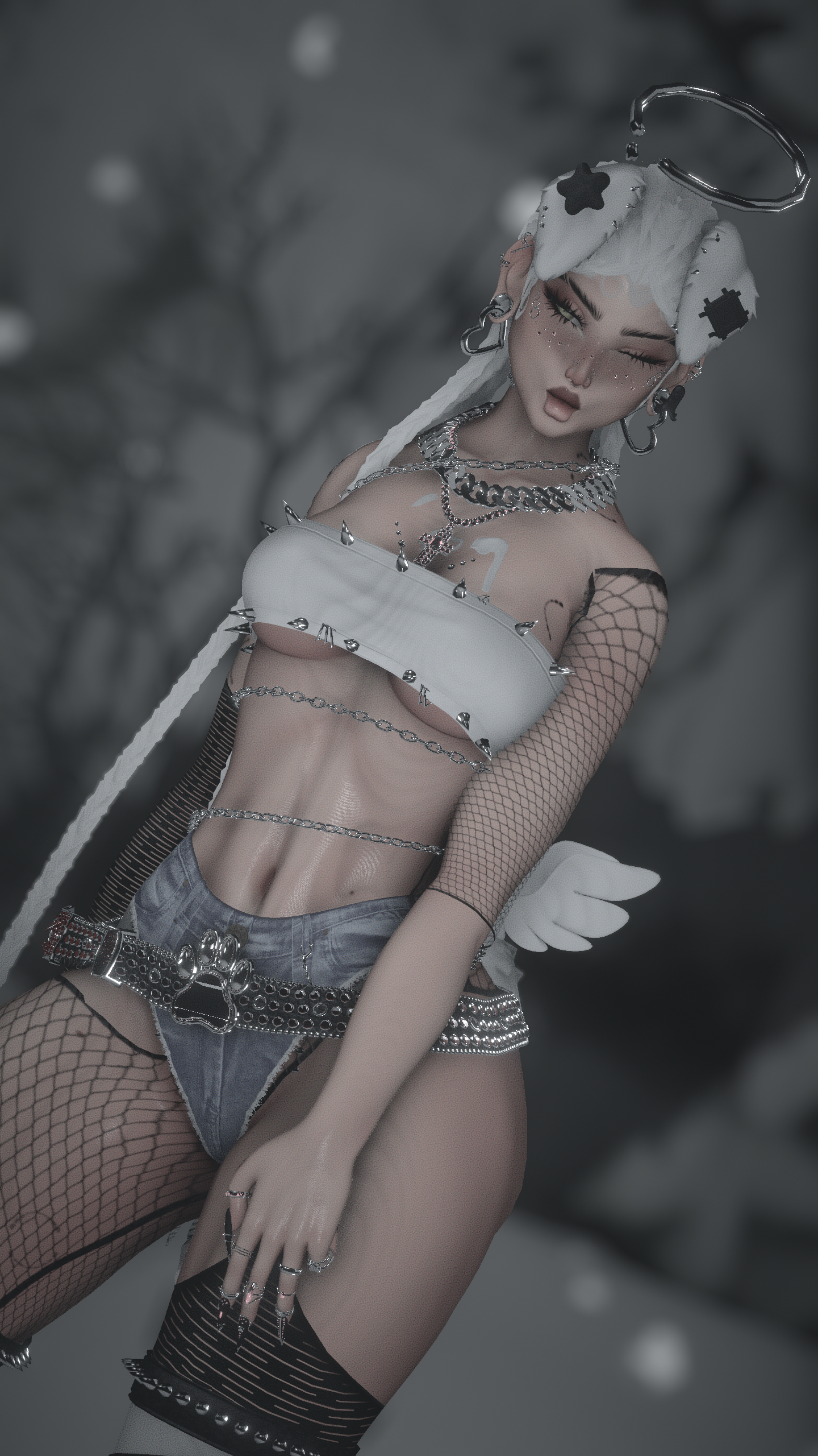 TShirt | Fishnet | Spike Boots | Leash | Knuckles | Onesie | Nails | Rings | Halo are made by me.