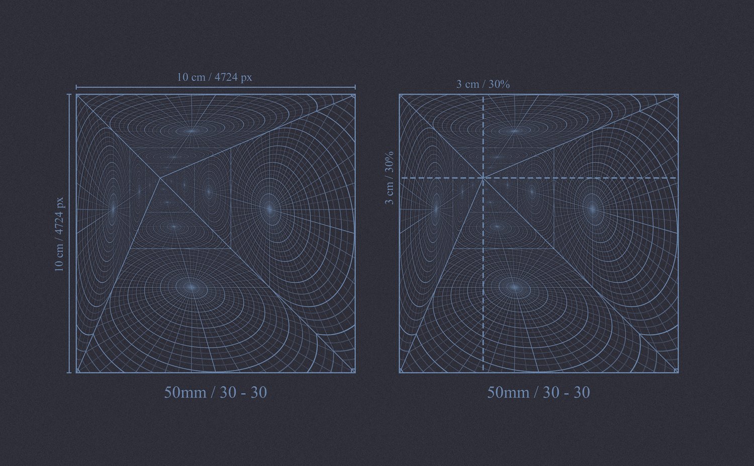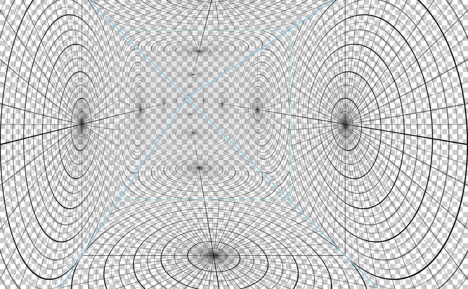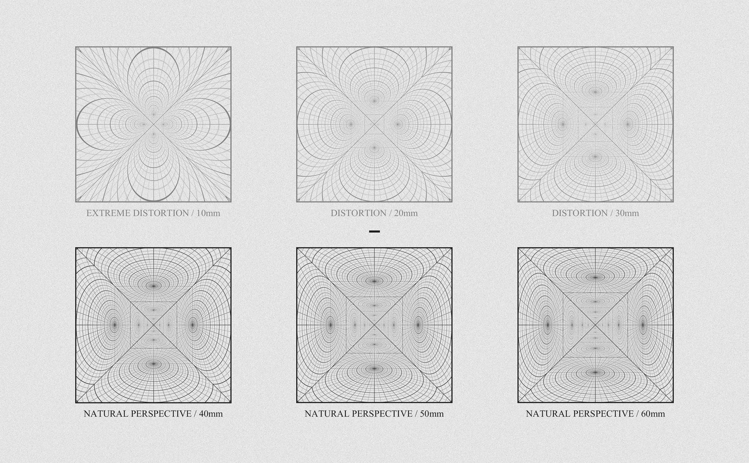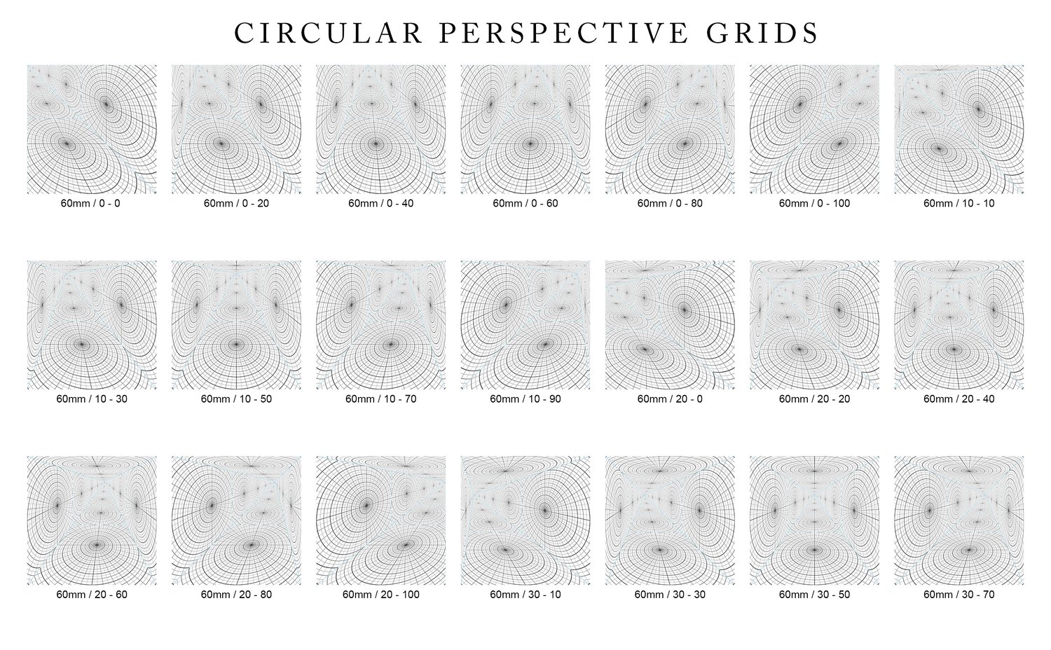 Each focal length (mm) has its corresponding graph paper, from Adobe Photoshop use distortion transformation, position the corners of the graph paper at the vanishing point (one point perspective) and at the guide points. Repeat this process to create complex perspective grids.