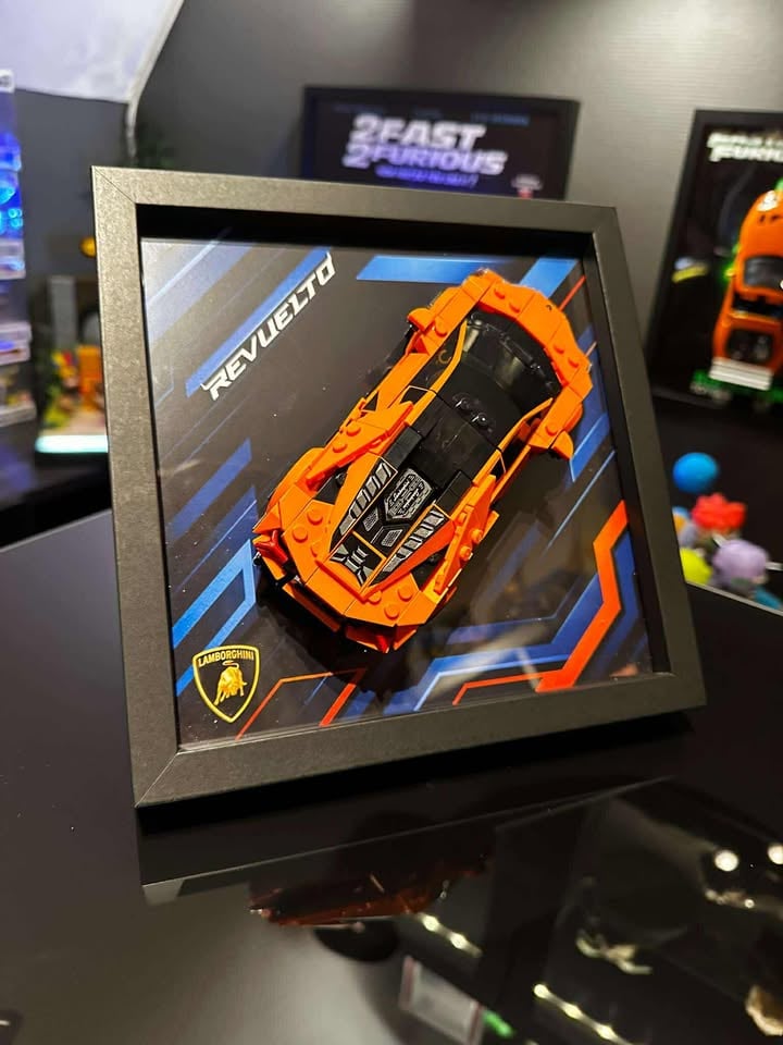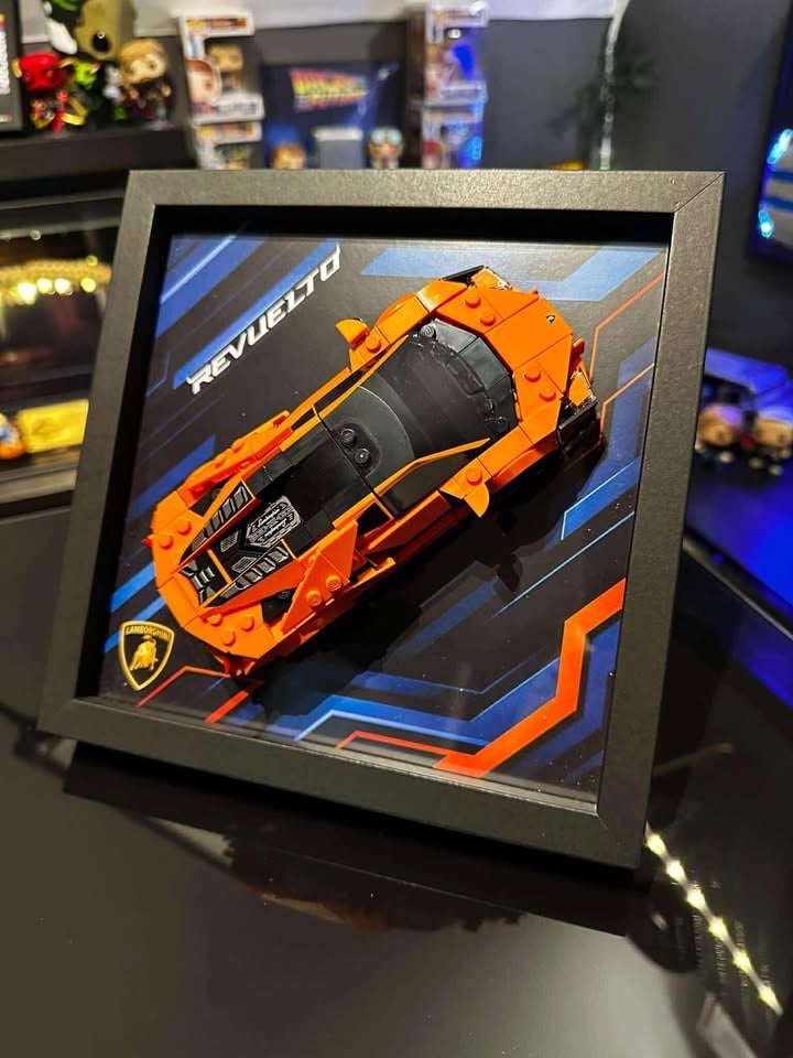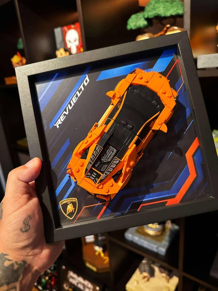Mets ta Lamborghini Revuelto LEGO Speed Champions (#77238) en valeur avec ce fond de cadre design spécialement conçu pour un rendu compact, sportif et élégant.