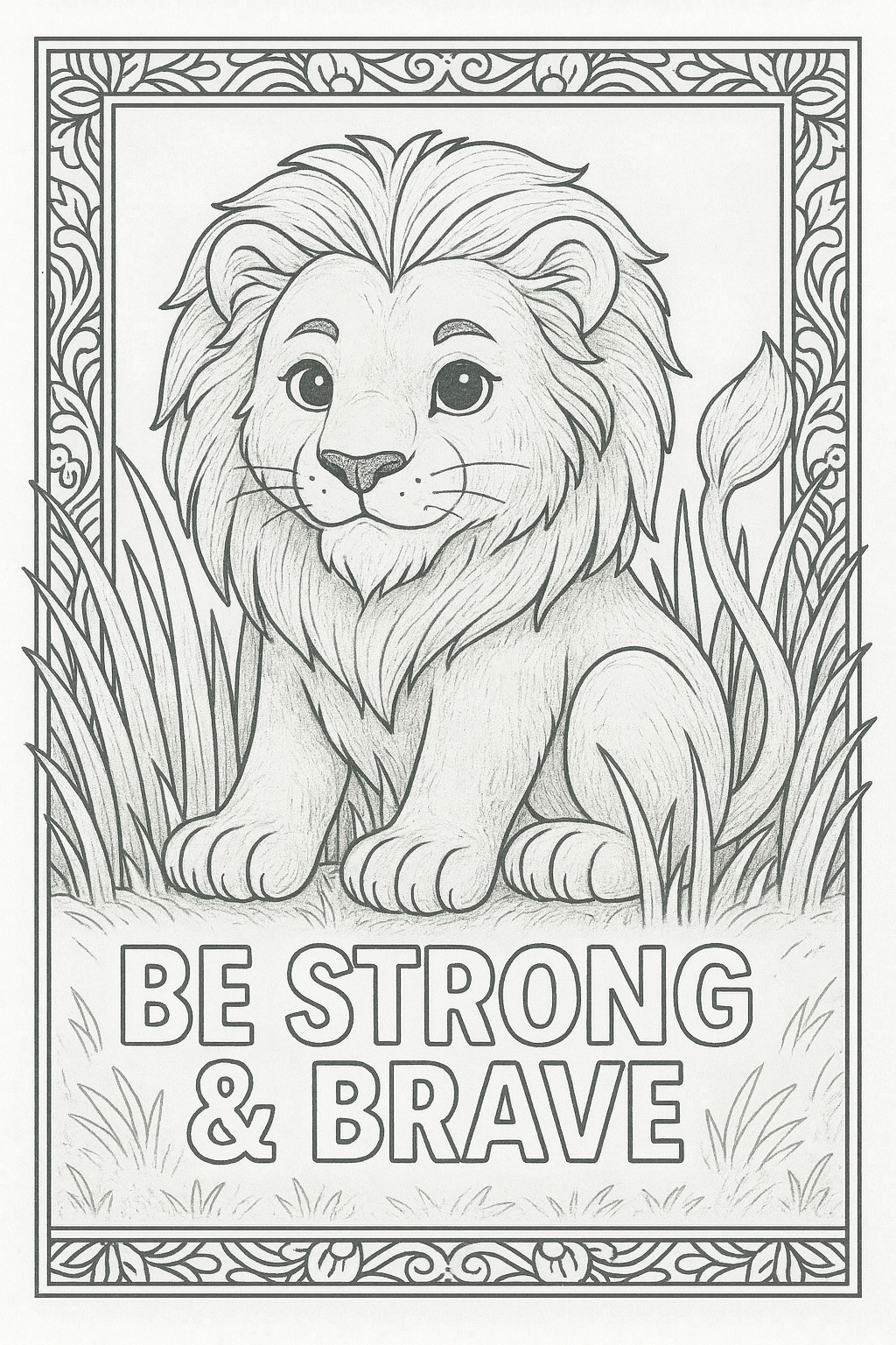 Inspire courage and creativity with this Lion Affirmation Coloring Page, featuring a friendly lion seated in a leafy frame and the bold message “BE STRONG & BRAVE.” This printable encourages emotional strength, spiritual confidence, and joyful expression — perfect for children’s ministry kits, homeschool activities, or quiet reflection time.