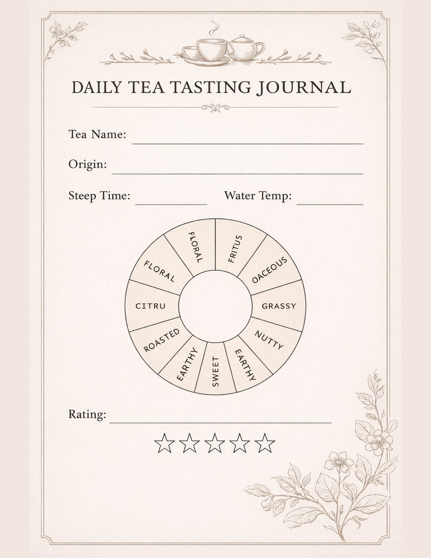 Capture every cup, from your everyday favorites to rare finds, with this 120-page Daily Tea Tasting Journal. Designed for tea lovers, students of tea, and curious beginners, this low-content journal gives you a simple, beautiful space to record your tasting notes and daily reflections.