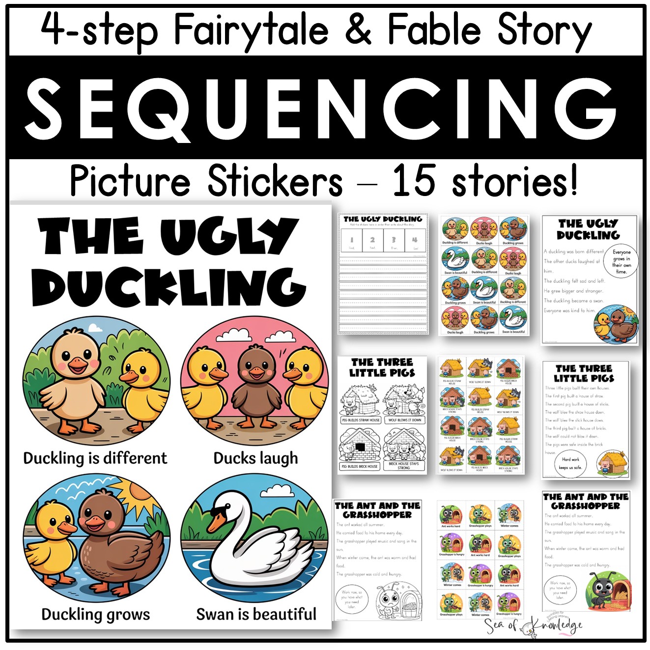 This story sequencing bundle includes classic fairy tale and fable sequencing activities designed for preschool, kindergarten, and early primary students. These story sequencing worksheets, cut and paste sequencing activities, and sequencing sticker activities support retelling, comprehension, and beginning writing skills. Perfect for kindergarten sequencing, preschool sequencing activities, ESL and EAL learners, and special education, this resource is ideal for literacy centers, story retelling activities, beginning middle end sequencing, and early writing practice using familiar fairy tales and fables.