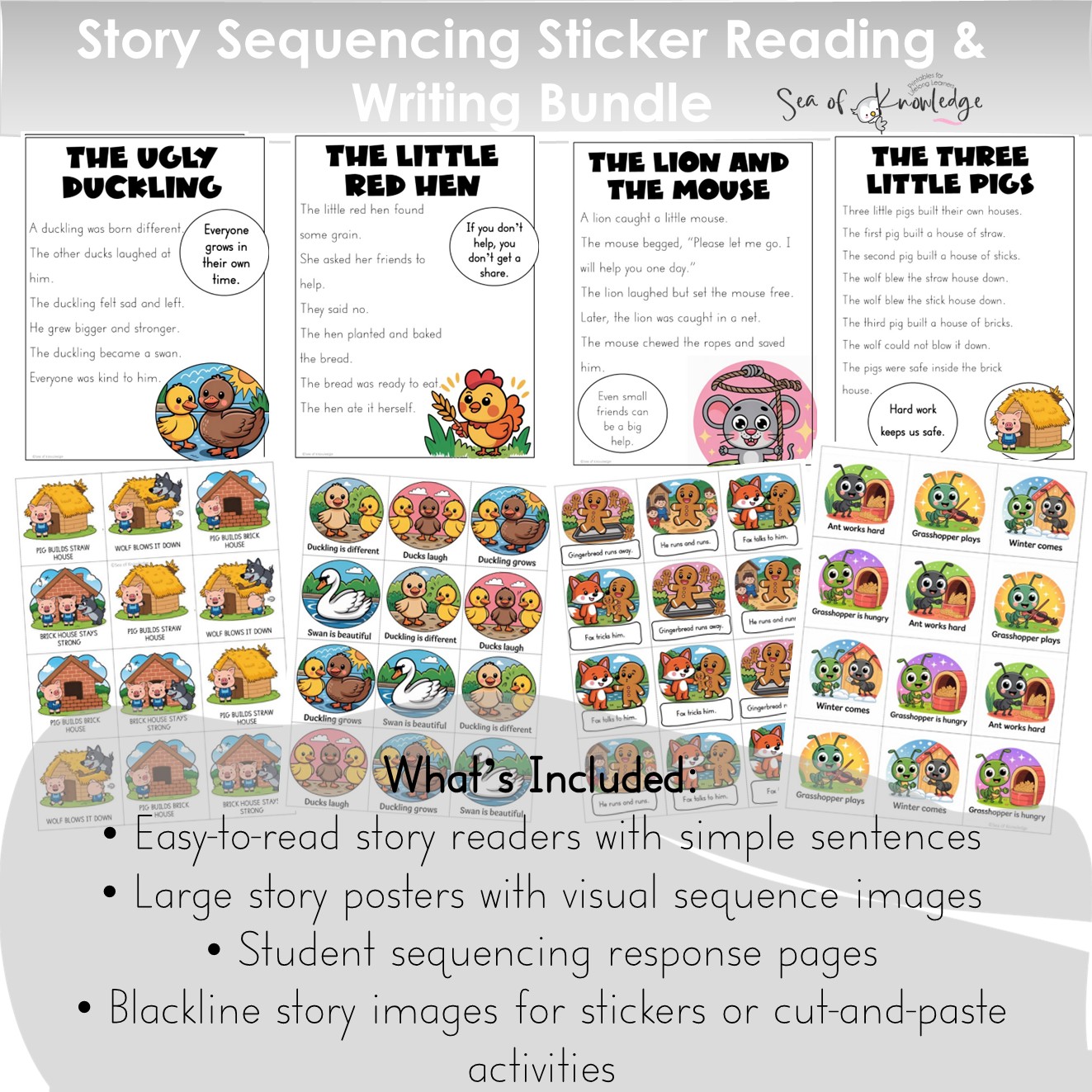 Make story sequencing, retelling, and early writing simple, visual, and hands-on with this Story Sequencing Sticker Writing Bundle featuring classic fairy tales and fables that students already know and love.