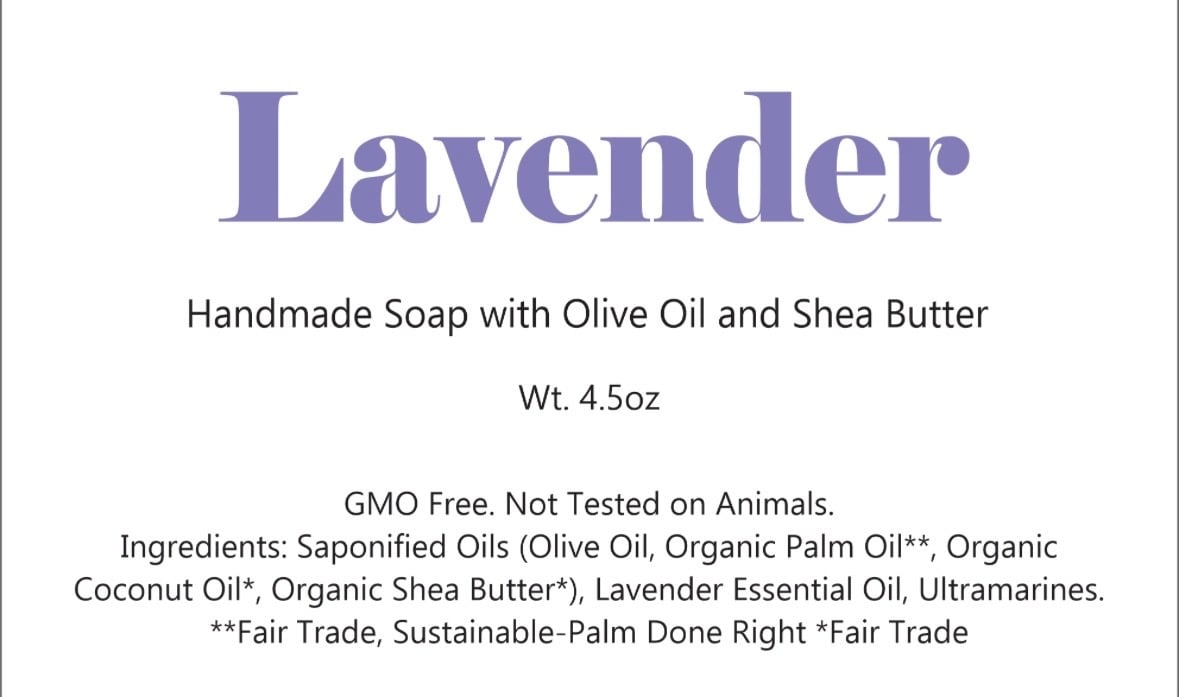 Ingredients: Saponified Oils (Olive Oil, Organic Palm Oil**, Organic Coconut Oil*, Organic Shea Butter*), Lavender Essential Oil, Ultramarines. **Fair Trade, Sustainable-Palm Done Right, *Fair Trade
