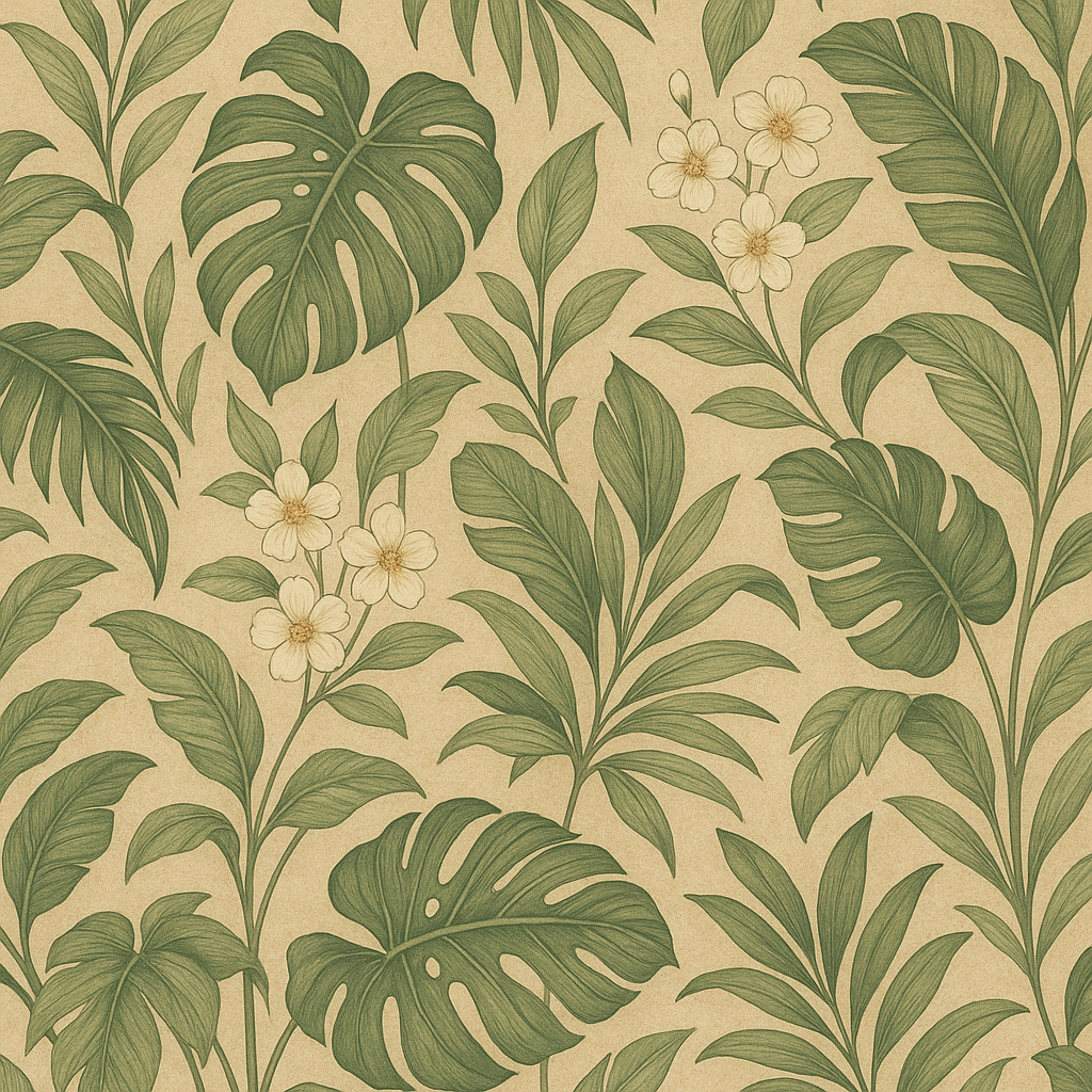 A lush, vintage-style botanical illustration featuring a variety of tropical leaves and delicate cream-colored flowers. The artwork is set against a soft tan background, evoking a warm, natural, and earthy feel—perfect for prints, wallpapers, or digital decor.