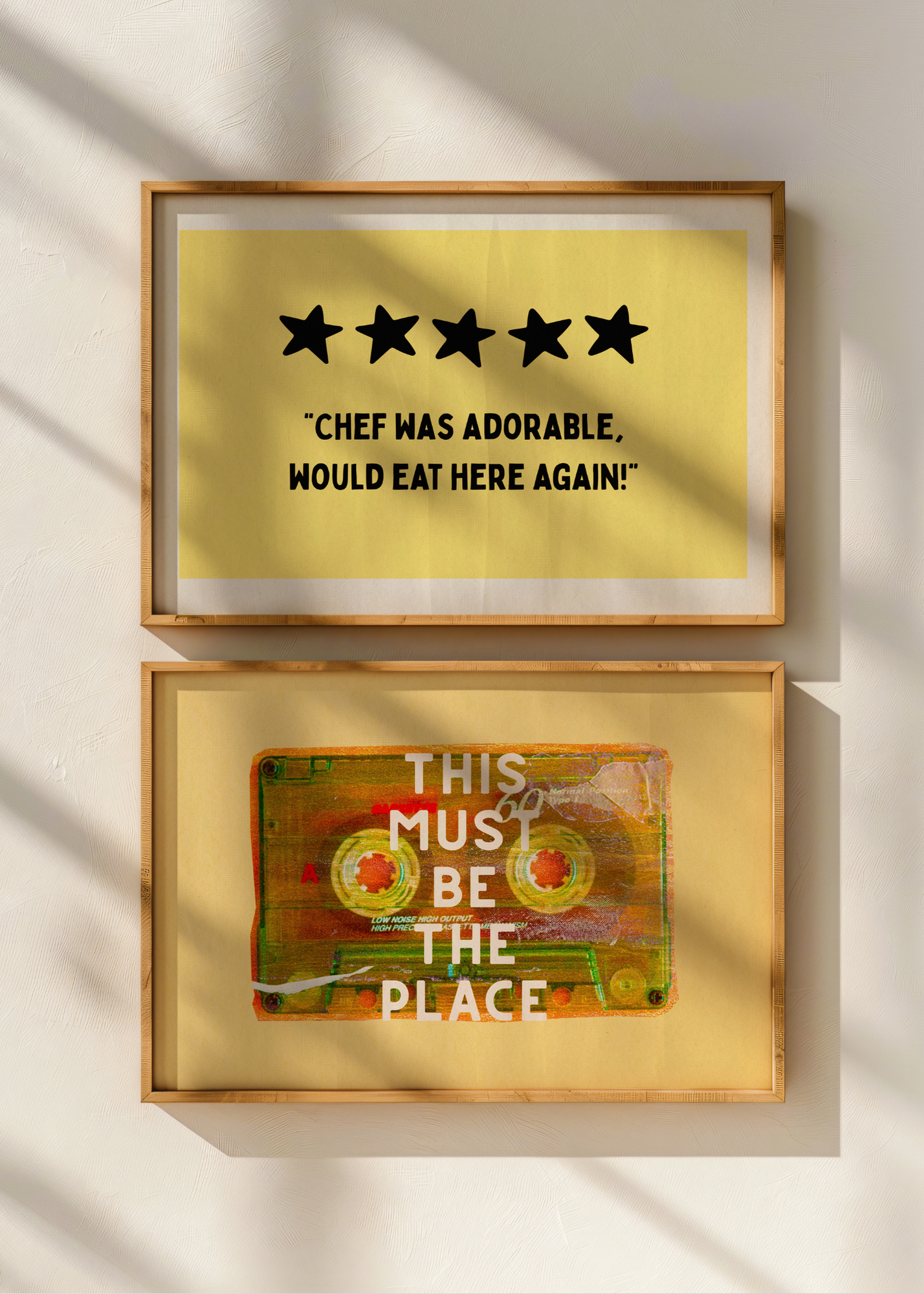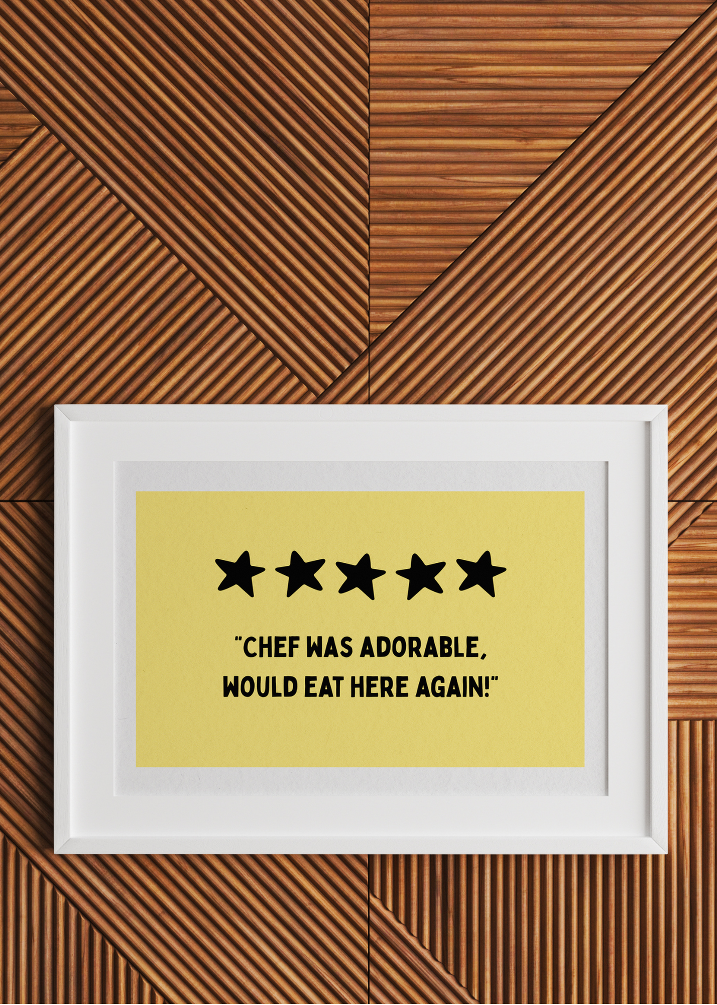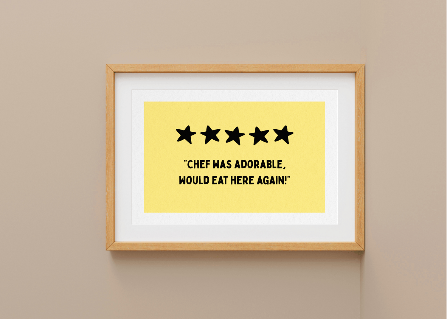 Chef Was Adorable— With its buttery yellow background and bold five-star review, this cheeky print is both modern and playful. The quote—“Chef was adorable, would eat here again!”—is a wink to charming dinners, comfort food, and the irresistible magic of meals made with love. Perfect for kitchens and dining spaces that value laughter as much as flavor.