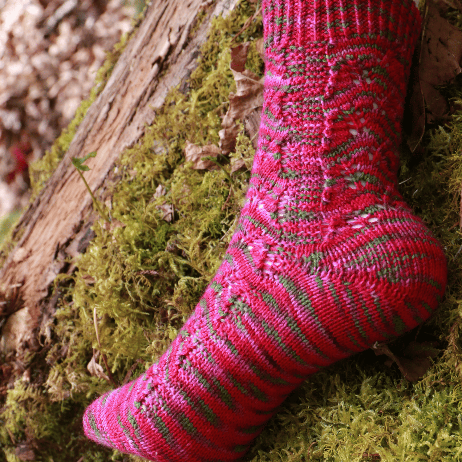 This sock has lace panels of blooming thistles interspersed with garter ridges that represent the fields of green grass where thistles are typically found.