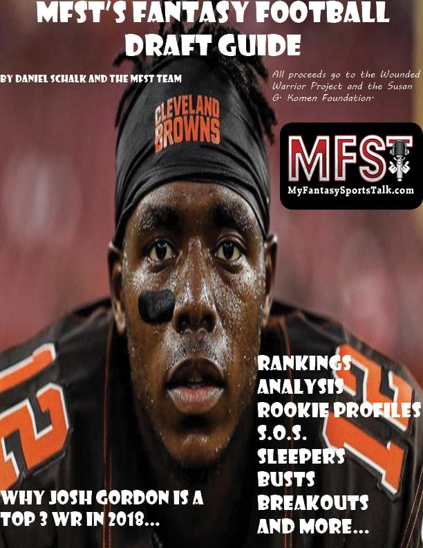 MFST's 2018 Fantasy Football Guide! The writers of MyFantasySportsTalk.com bring you a unique set of rankings, analysis, strategies and more to help you craft the perfect fantasy team. Whether it's a redraft or dynasty league we have you covered. All proceeds of this book will go to the Wounded Warrior Project and the Susan G. Komen Foundation. So help two great causes and help your 2018 fantasy football team along the way!