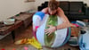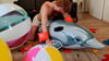 After that he inflate his arm bands and start destroying inflatable toys, most of them by biting.