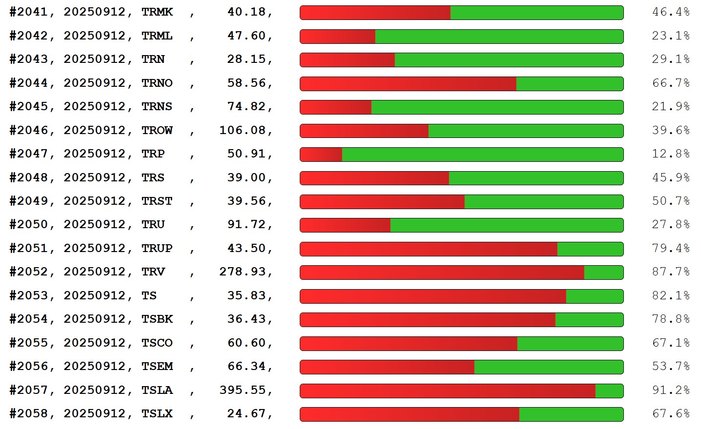 This is a video file that shows the downside and upside potential of each of more than 2000 major US stocks. This includes all the most important high-tech and popular, actively-traded stocks such as A, AA, AAOI, AAON, AAPL, ABBV, ABNB, ABT, ACAD, ACGL, ACHC, ACMR, ACN, ADBE, ADI, ADM, AEM, AEP, AFL, AFRM, AGI, AIG, AKAM, AKRO, AL, ALAB, ALB, ALC, ALK, ALKS, ALLY, AMAT, AMGN, AMH, AMKR, AMSC, AMT, AMZN, ANET, ANF, APA, APH, APLS, APO, APP, APTV, AR, ARCC, ARE, ARM, ARMK, AROC, ARWR, AS, ASB, ASO, ASTS, ATI, AXP, AZN, BA, BABA, BAC, BAH, BALL, BAM, BAX, BBIO, BBWI, BBY, BCE, BE, BEN, BF.B, BG, BHP, BIDU, BIIB, BILI, BILL, BIRK, BK, BKR, BMRN, BMY, BN, BNS, BNTX, BOX, BP, BRBR, BRK.B, BRKR, BRO, BROS, BRX, BRZE, BSX, BTI, BTSG, BUD, BWA, BX, BXP, BXSL, BZ, C, CADE, CAKE, CARR, CART, CAT, CAVA, CB, CCI, CCJ, CCK, CCL, CCOI, CDNS, CELH, CENX, CFG, CG, CGNX, CGON, CHRW, CHTR, CHWY, CIEN, CIVI, CL, CLDX, CLS, CLX, CMA, CMCSA, CME, CMS, CNC, CNI, CNK, CNM, CNP, CNQ, CNX, COF, COHR, COIN, COLB, COO, COP, CP, CPB, CPNG, CPRT, CRBG, CRDO, CRH, CRM, CRNX, CROX, CRSP, CRWD, CSCO, CSX, CTRA, CTRE, CTRI, CTSH, CTVA, CUK, CVI, CVNA, CVS, CVX, CYTK, CZR, D, DAL, DAR, DASH, DAY, DB, DBX, DD, DDOG, DE, DECK, DELL, DG, DHI, DHR, DINO, DIS, DK, DKNG, DKS, DLR, DLTR, DOCN, DOCS, DOCU, DOW, DT, DUK, DUOL, DVN, EA, EBAY, EGO, EIX, EL, ELS, ELV, EMN, EMR, ENB, ENPH, ENTG, EOG, EPD, EPR, EPRT, EQH, EQNR, EQT, ES, ESTC, ETHE, ETHU, ETN, ETR, ETSY, EW, EXAS, EXC, EXEL, EXTR, EYE, FANG, FAST, FBIN, FCX, FE, FEIM, FERG, FHN, FI, FIS, FITB, FIVE, FIVN, FLEX, FLS, FLUT, FMC, FND, FORD, FOX, FOXA, FRO, FTI, FTNT, FTV, FUN, FYBR, G, GCT, GDS, GE, GEHC, GEN, GEV, GFI, GFS, GGAL, GH, GILD, GIS, GLOB, GLPI, GLW, GM, GMAB, GME, GNTX, GOOG, GOOGL, GPN, GSK, GTES, GTLB, HAE, HAL, HD, HESM, HIMS, HOG, HOMB, HON, HOOD, HPE, HPQ, HRB, HRL, HSAI, HTHT, HUT, HWM, IBEX, IBKR, IBM, IBN, ICE, ICLR, IFF, ILMN, INCY, INDV, INFA, ING, INOD, INSM, INTA, INTC, INTU, INVH, IONQ, IONS, IP, IPG, IR, IREN, ISRG, IT, IVZ, JCI, JD, JNJ, JPM, K, KD, KDP, KGC, KGS, KHC, KIM, KKR, KLG, KMB, KMI, KMX, KNTK, KNX, KR, KRG, KTOS, KVYO, LEGN, LEN, LEVI, LI, LITE, LKQ, LLY, LMND, LNC, LOW, LQDA, LRCX, LSCC, LTH, LULU, LUV, LVS, LYB, LYV, MA, MAS, MCD, MCHP, MDLZ, MDT, MET, META, METC, MGM, MGNI, MGY, MIR, MKC, MLI, MMC, MMM, MNST, MO, MOS, MP, MPC, MPLX, MRK, MRNA, MRUS, MRVL, MS, MSFT, MSTR, MTCH, MTG, MU, MUR, NAMS, NCLH, NCNO, NDAQ, NE, NEE, NEM, NFLX, NI, NKE, NLY, NNE, NRG, NSC, NTAP, NTNX, NTR, NVDA, NVO, NVS, NVST, NWSA, NXPI, NYT, O, ODFL, OHI, OKE, OKLO, OKTA, OLN, OMC, ON, ONB, ONON, ONTO, OPCH, ORCL, ORLY, OUST, OVV, OXY, PAAS, PANW, PAR, PBA, PBF, PCAR, PCVX, PDD, PEG, PEGA, PEP, PFE, PFGC, PGR, PGY, PHR, PHYS, PII, PINS, PLAY, PLD, PLTR, PM, PPC, PPG, PPL, PRGO, PSTG, PTCT, PYPL, QCOM, QFIN, QRVO, QSR, RAPP, RARE, RBLX, RBRK, RCL, RDDT, REXR, REZI, RF, RH, RIO, RKLB, RMBS, RNA, RNG, ROKU, ROL, ROST, RPRX, RRC, RSI, RTX, RVMD, RYAN, SAP, SATS, SBAC, SBUX, SCCO, SCHW, SE, SEDG, SEE, SFM, SHEL, SHOO, SHOP, SHW, SIRI, SJM, SLB, SLG, SLGN, SLM, SLNO, SM, SMCI, SMR, SMTC, SNOW, SNPS, SNV, SNY, SO, SOFI, SOLV, SONY, SPHR, SPNS, SRE, SRRK, SSRM, ST, STM, STX, STZ, SU, SWK, SWKS, SYF, SYM, SYY, T, TAP, TECH, TECK, TEM, TER, TFC, TGNA, TGT, TGTX, TJX, TME, TMO, TMUS, TOST, TPR, TRP, TRU, TS, TSCO, TSEM, TSLA, TSM, TSN, TTD, TTE, TTMI, TVTX, TW, TWLO, TWST, TXN, U, UAL, UBER, UBS, UDR, UGI, UL, UNH, UNM, UNP, UPS, UPST, URBN, USB, USFD, V, VICI, VLO, VNO, VRT, VSAT, VSCO, VST, VTR, VVV, VZ, W, WAY, WBS, WCN, WDAY, WDC, WEC, WELL, WFC, WIX, WMB, WMG, WMT, WPM, WRB, WRBY, WTRG, WWW, WY, XEL, XOM, XYL, YETI, YPF, YUM, YUMC, ZM, ZTS, and LOTS MORE!