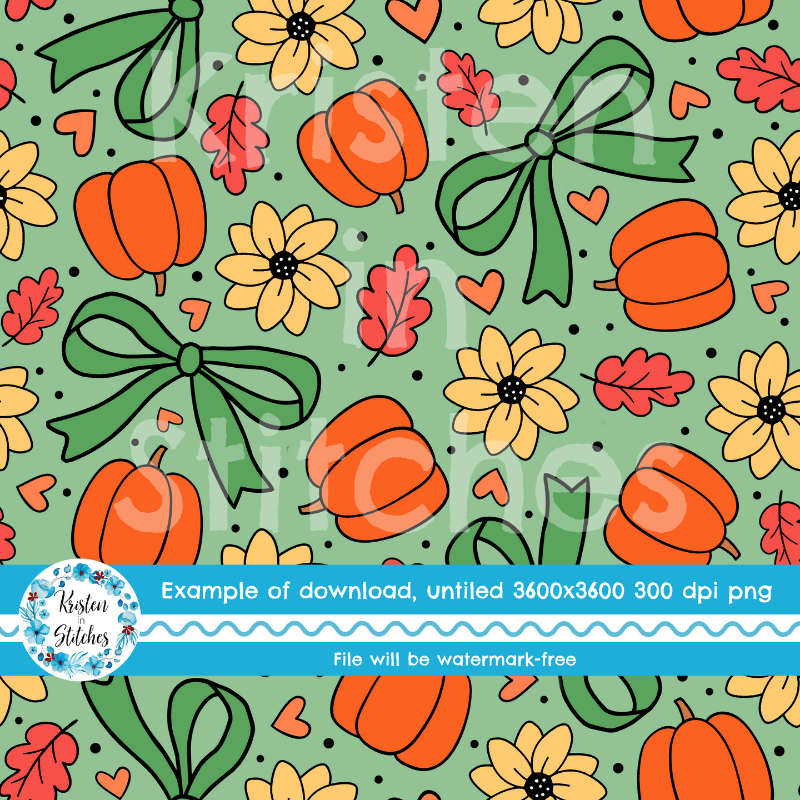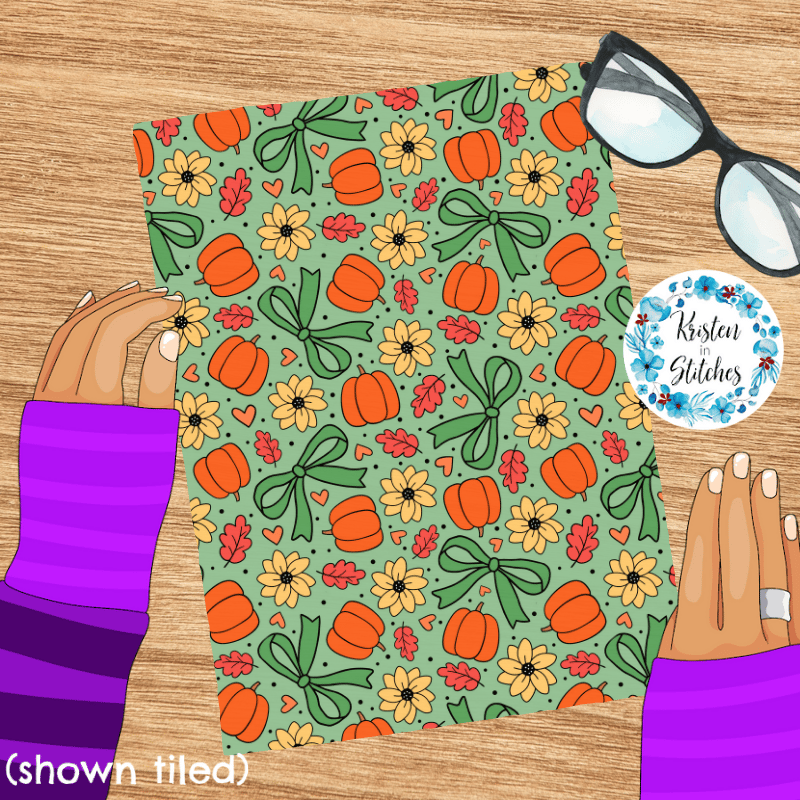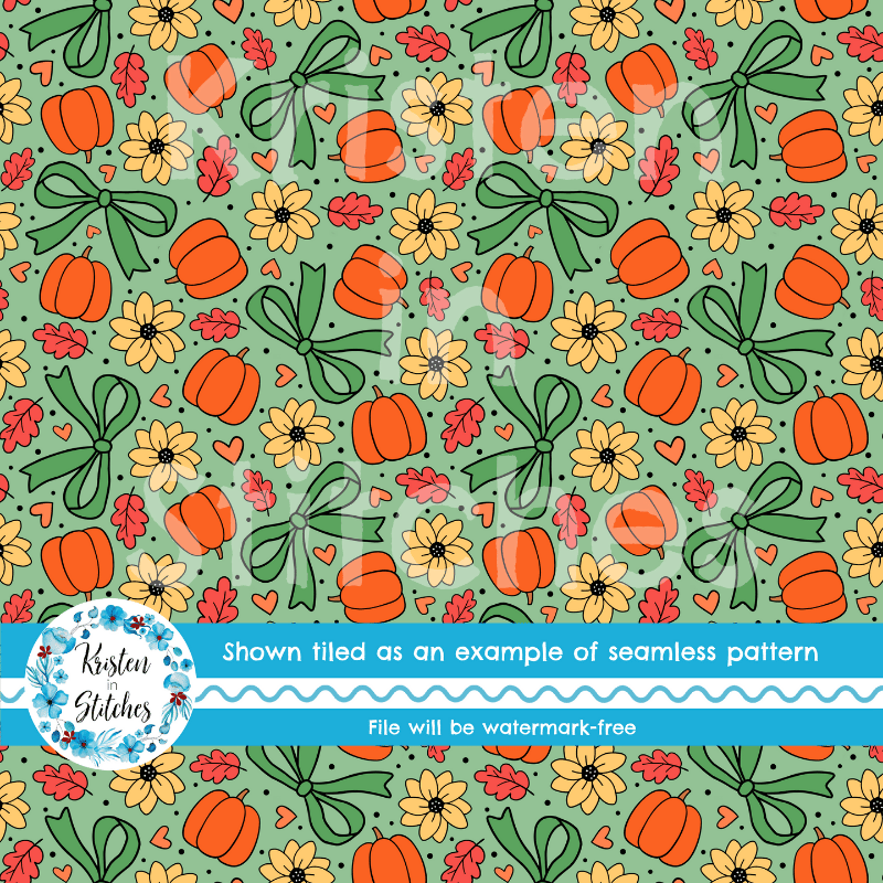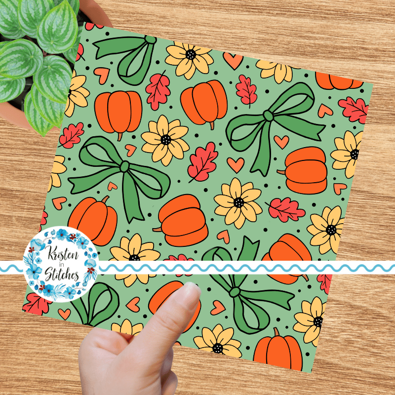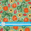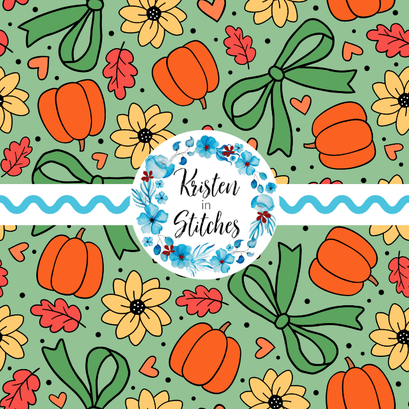 A pretty pattern for the fall season, with pumpkins, leaves, sunflowers and bows on green.