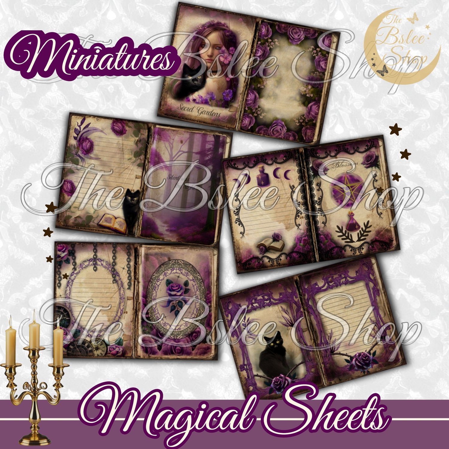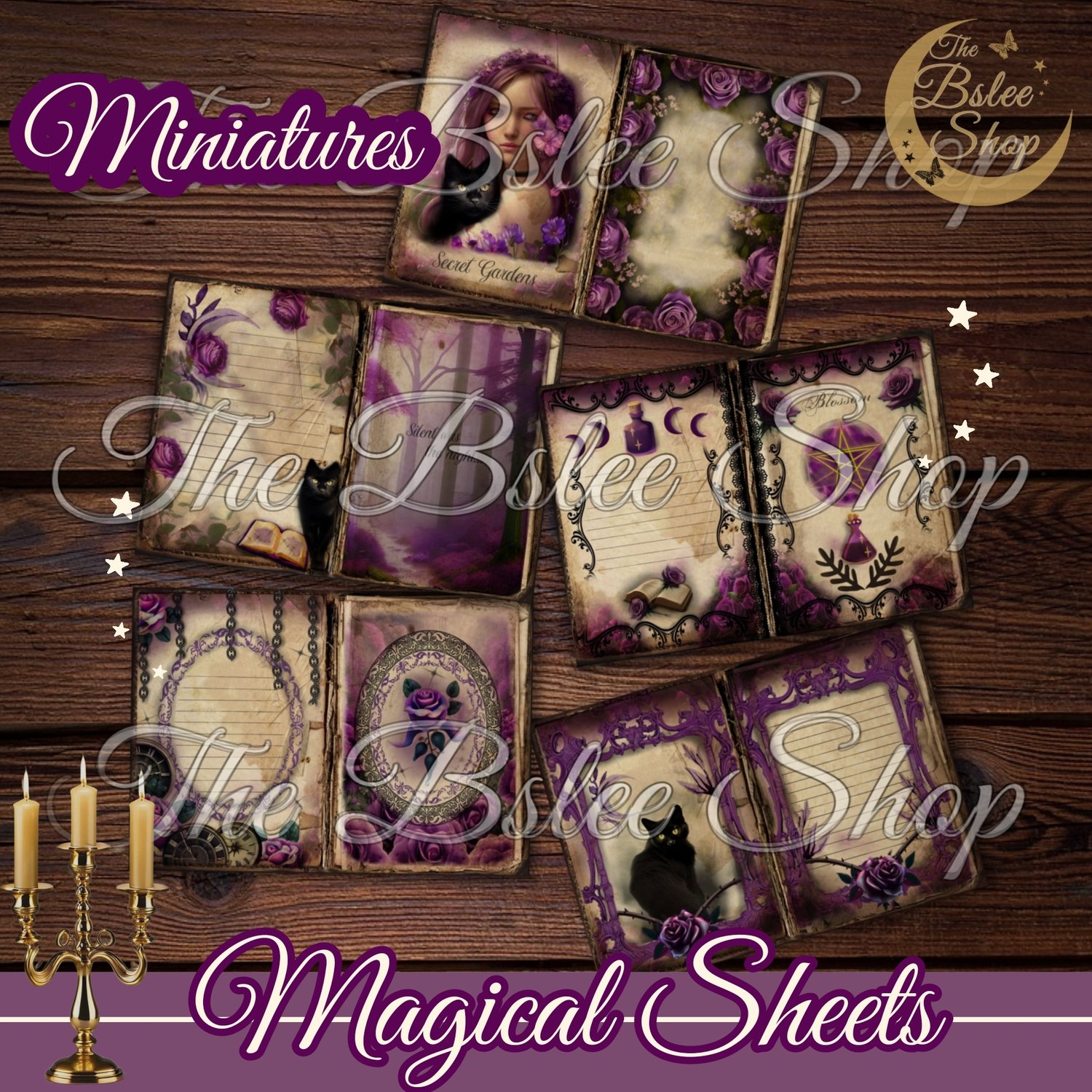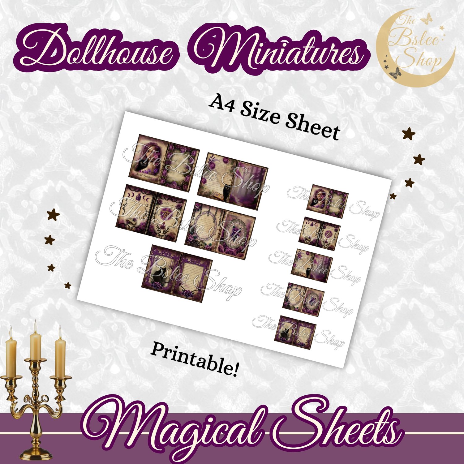 Miniature Purple Magic Sheets, Witchy Dollhouse Decor, Whimsy Miniatures, Witch’s Brew Potion Recipes, Mini Spell Book, Miniature Grimoire, Mini Book Of Shadows, Fairy Garden Decor, Mini Black Cat