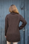Materials: Bulky weight acrylic/wool blend: 1200 (1285, 1415, 1505) (1670, 1755, 1895, 2025) (2205, 2315, 2445, 2565) yards. NOTE: If you plan to increase the length of the BODY or SLEEVES, be sure to purchase extra yarn. Model knit in Plymouth Yarn Encore Chunky (75% acrylic / 25% wool; 100 grams / 143 yards): #1444 Brown Heather.