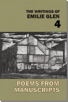 THE WRITINGS OF EMILIE GLEN 4 - POEMS FROM MANUSCRIPTS. This fourth and final volume collects all the unpublished manuscripts left by New York poet Emilie Glen. These 180 poems, lyric and narrative, far from being the "bottom drawer" of the poet's work, contain the same urban savor as her longer works. Some of these poems were read by the poet repeatedly at the poetry salon she ran in Greenwich Village, and prior to that, at the salon she ran at her high-rise apartment on the Lower East Side in the 1960s and 1970s. As always, her most engaging poems are miniature short stories, all set against a noir Manhattan that includes both shocking murders as well as moments of unexpected beauty among fire escapes, trash cans, alley cats, and the migratory birds in Central Park. The book includes several surprisingly experimental works and a true account of a horrifying psychopath who ran a Greenwich Village coffee house.