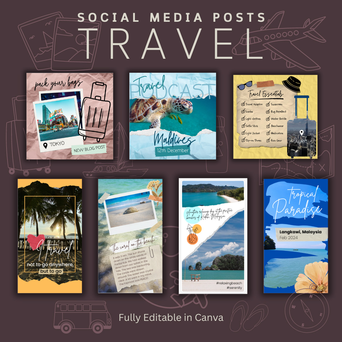 30 Instagram post templates for Travel Bloggers and Influencers. Posts have vintage scrapbook theme. Posts can be quickly and easily editable in Canva.