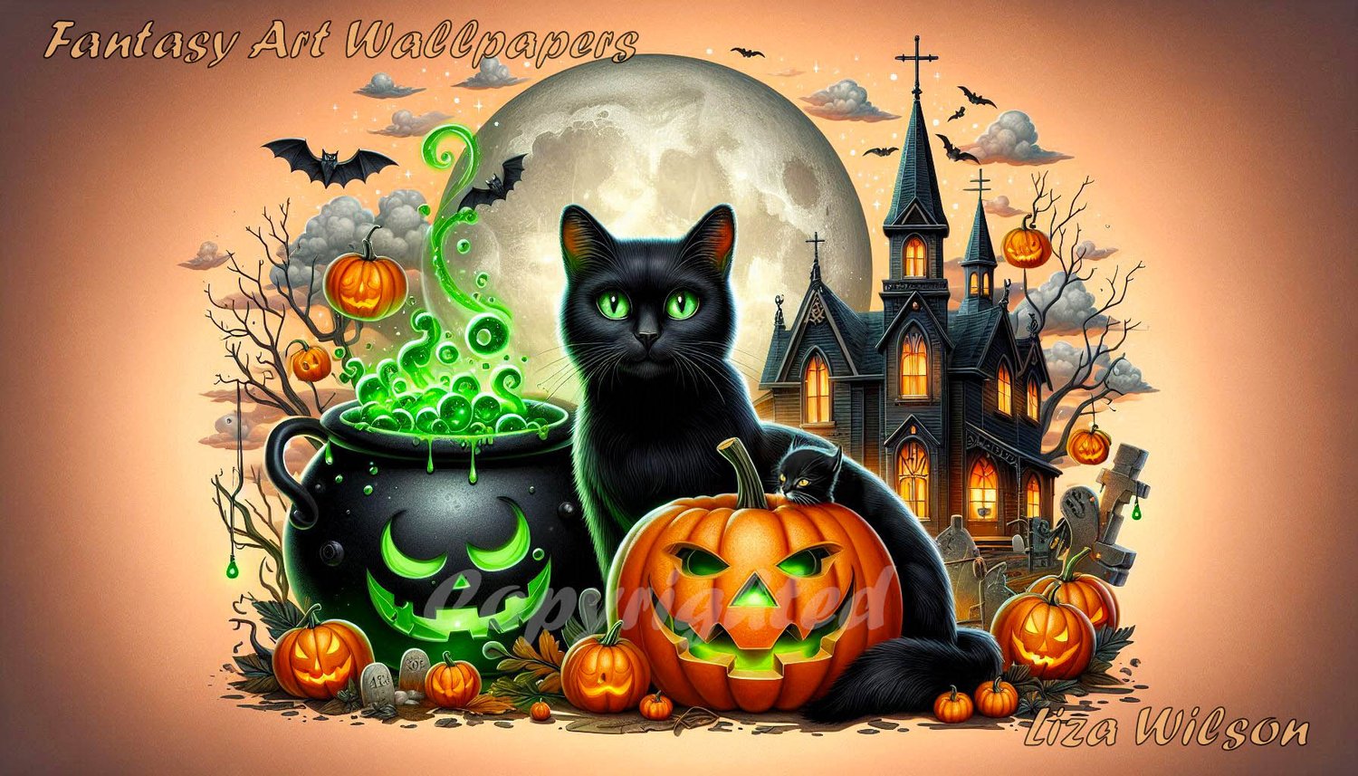 Halloween black cat with spooky haunted houses, bubbling green cauldrons, dark trees, tombstones, glowing pumpkins, & bats silhouetted in a moonlit sky with a peachy orange background glow.