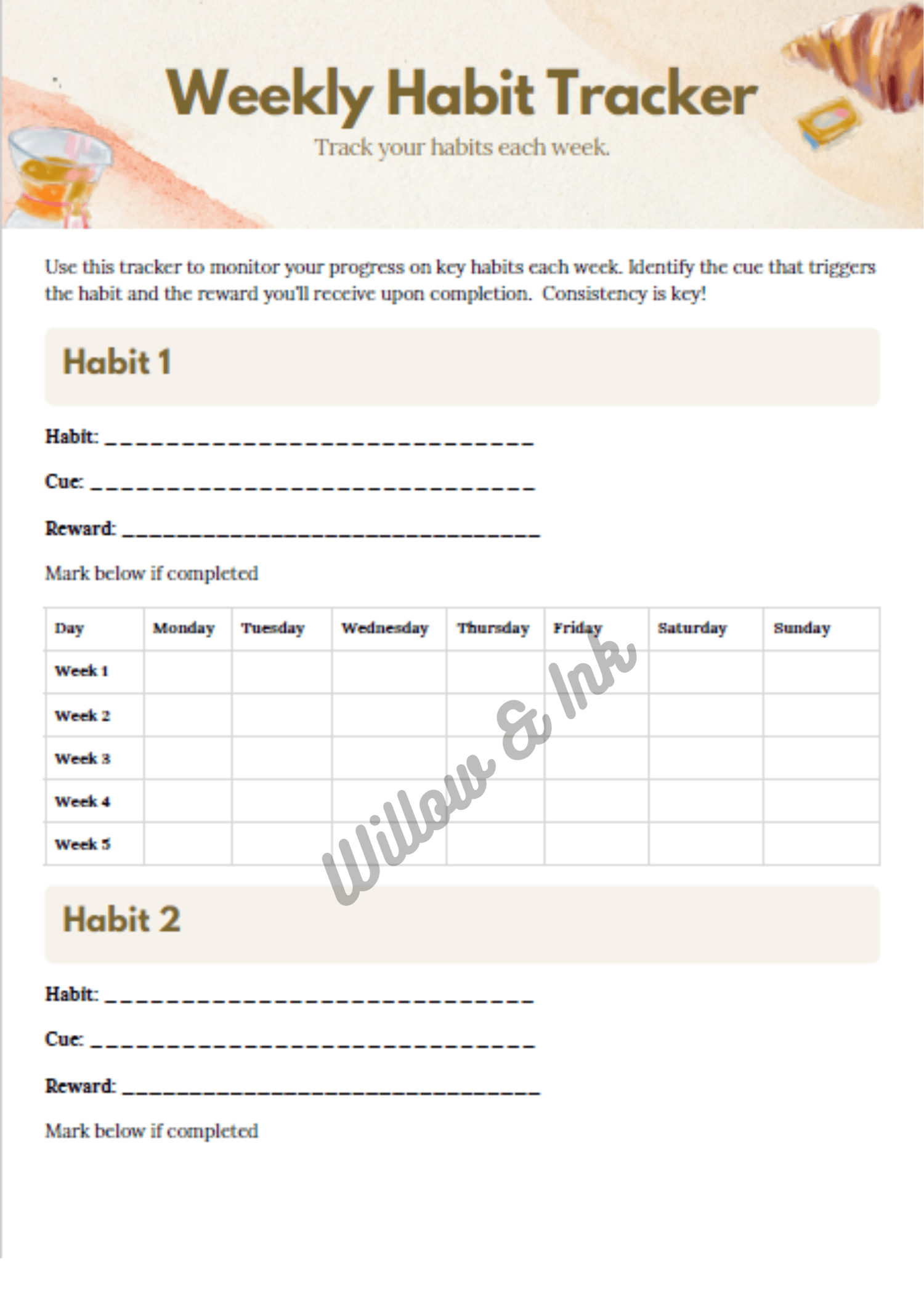 Track up to 5 habits, with space for cue + reward. Simple. Visual. Effective.